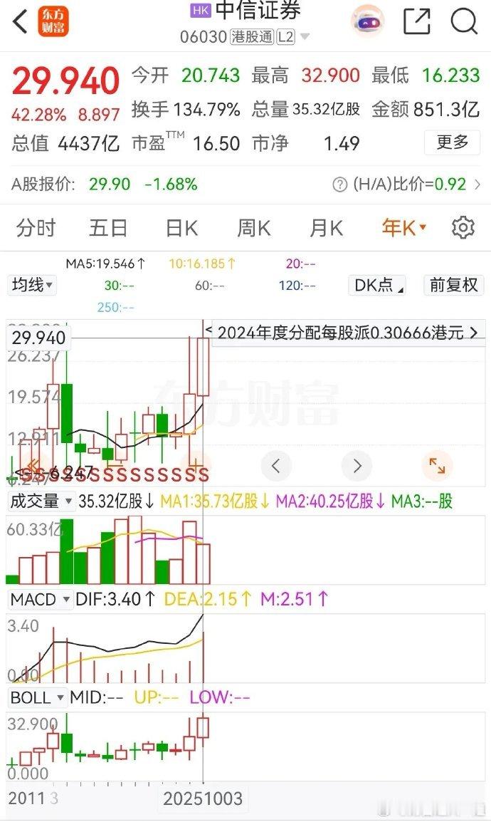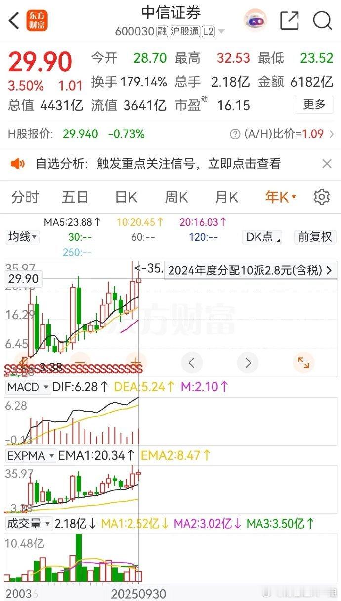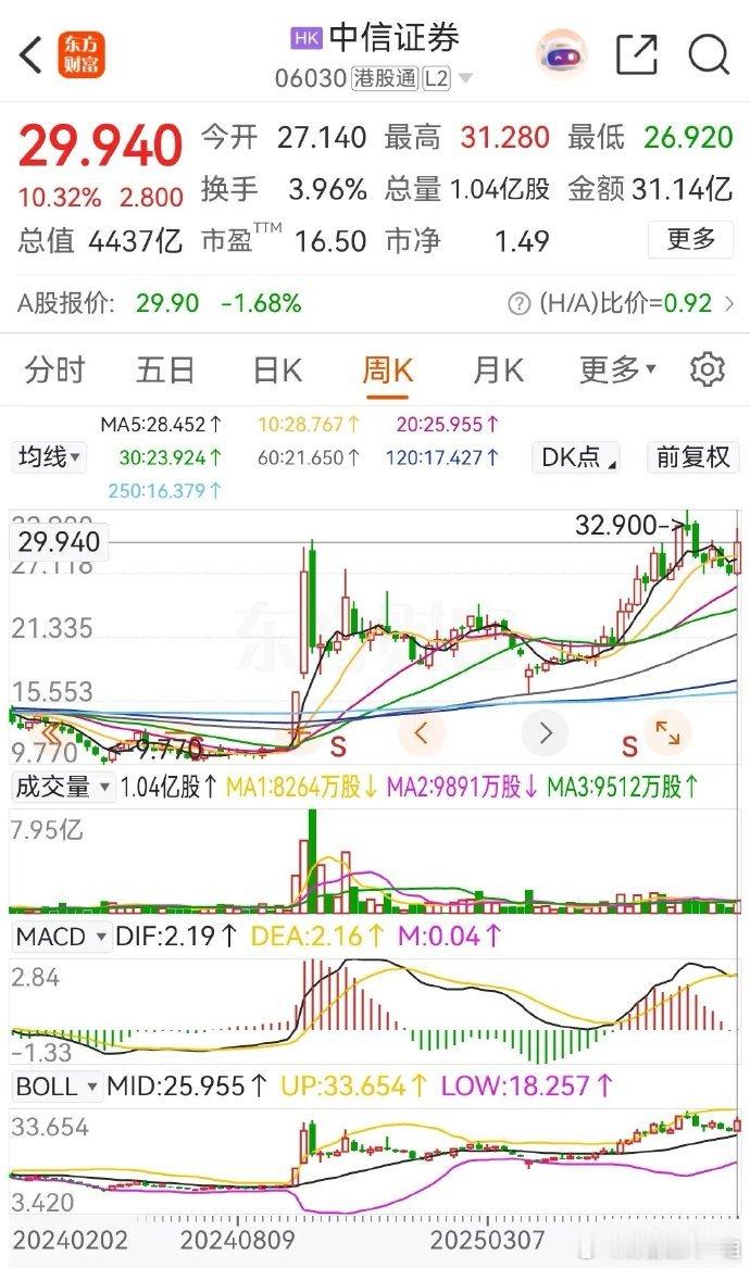 中信证券H股今年大涨42.28%,当前的报价为29.940港元,总市值为4437亿港元。众所周知,中信证券被称为券商一哥,今年的整体表现不错,前三季度能有这样的涨幅不算差。下面来看看本周的走势,10月 1日国庆休市,所以本周只有四个交易日,周一的涨幅最大,高达11.79%,周二涨1.52%,周四和周五小幅调整,本周的周线收阳,上涨的幅度为10.32%,可以说是比较美好的一周了。另外,中信证券 A股今年的年涨幅仅为3.5%,可谓是惨淡极了。