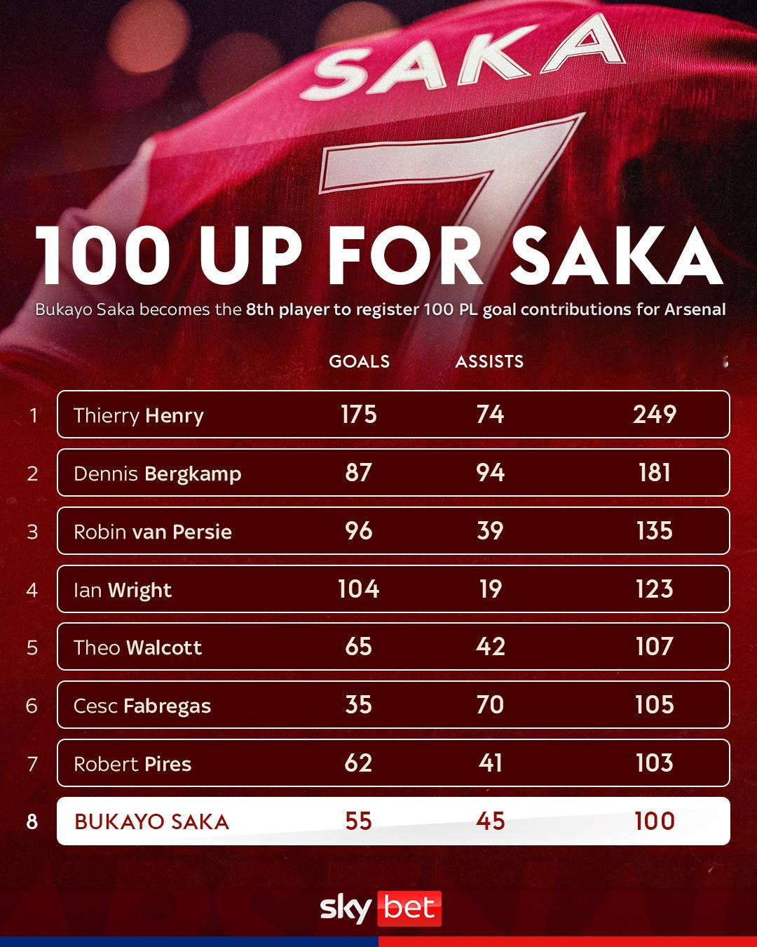 英超200场贡献55球45助,成为枪手历史上第八位解锁参与英超百球成就的球员。祝贺24岁的萨卡,再接再厉!