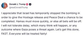 🚨🇺🇸特朗普:以色列、人质协议、绝不拖延 “我赞赏以色列暂时停止轰炸,以便给释放人质和达成和平协议提供一个完成的机会。 哈马斯必须迅速采取行动,否则一切结果都将不堪设想。 我不会容忍拖延(很多人认为这种情况会发生),也不会容忍加沙再次构成威胁的任何结果。 让我们尽快完成这件事。每个人都会得到公平对待! 资料来源:@realDonaldTrump 🚨🇺🇸 TRUMP: ISRAEL, HOSTAGE DEAL, AND NO DELAYS "I appreciate that Israel has temporarily stopped the bombing in order to give the Hostage release and Peace Deal a chance to be completed. Hamas must move quickly, or else all bets will be off. I will not tolerate delay, which many think will happen, or any outcome where Gaza poses a threat again. Let’s get this done, FAST. Everyone will be treated fairly!" Source: @realDonaldTrump