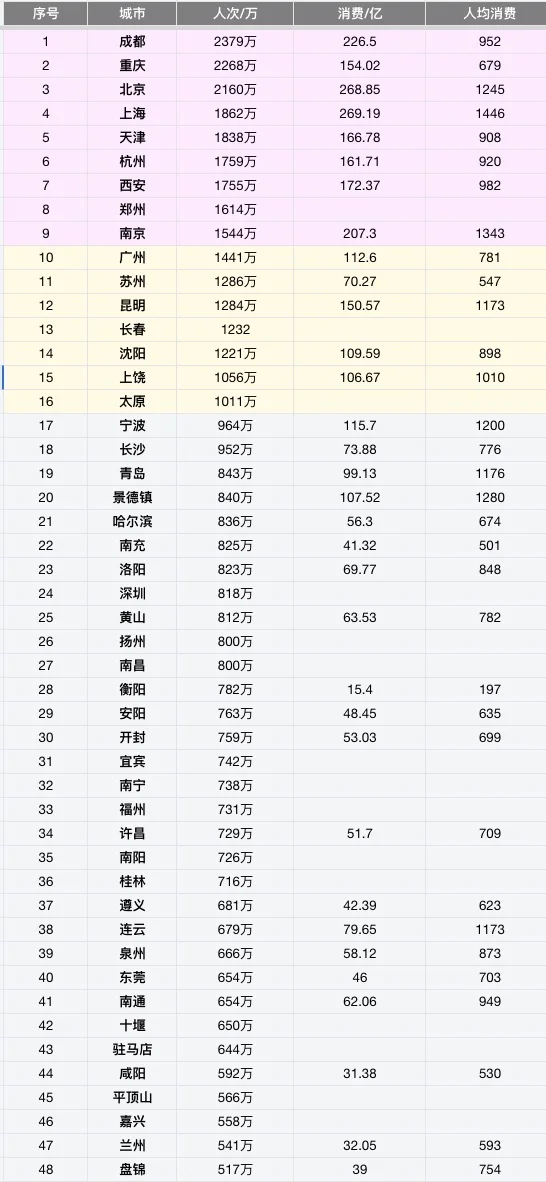[向右R]1500万人次以上:上海,天津,杭州,西安,郑州,南京(不科学,郑州咋这么多人)