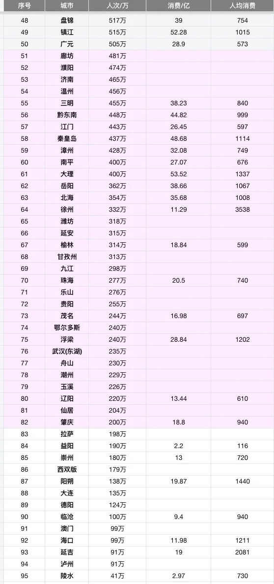 [向右R]1000万人次以上:广州,苏州,昆明,长春,沈阳,上饶,太原。(没想到长春,沈阳,太原也这么多人)