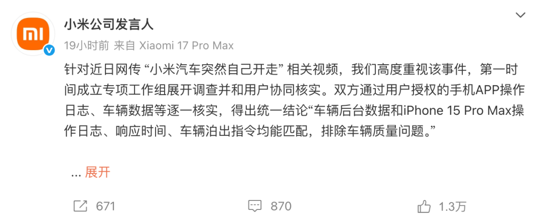 10月3日晚间,针对网传“小米汽车突然自己开走”相关视频,小米公司发言人做出回应。小米公司发言人表示,高度重视该事件,第一时间成立专项工作组展开调查并和用户协同核实。双方通过用户授权的手机APP操作日志、车辆数据等逐一核实,得出统一结论“车辆后台数据和iPhone15ProMax操作日志、响应时间、车辆泊出指令均能匹配,排除车辆质量问题。”