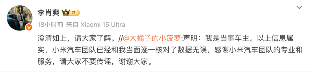 针对小米公司发言人的回应,当事人车主也在评论区声明:“以上信息属实,小米汽车团队已经和我当面逐一核对了数据无误,感谢小米汽车团队的专业和服务,请大家不要传谣,谢谢大家。”