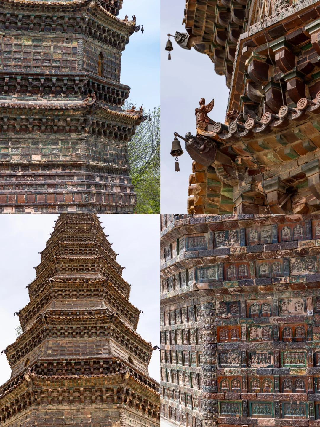 繁塔原为九层六边形塔,明代遭毁后仅存三层,清代加建六层小塔,形成塔上塔,砖雕佛像达7000余尊 ,塔内宋代碑刻《金刚经》为书法瑰宝。