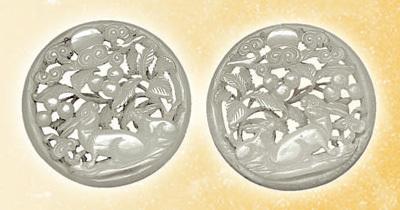 湖北省博物馆藏青白玉镂空东升图环饰的主角,就是一对可爱的兔子。这是一套明代梁庄王墓中出土的文物,共两件,大小一致,均为直径4.9厘米,厚0.5厘米,纹饰互为镜像。玉质呈青白色,圆形,正面微凸,油脂光泽。外缘雕琢成环形,环内镂雕双兔望月图。从制作工艺上看,这件环饰采用了双层透雕技法,分层展现画面元素:上端刻画数朵“骨朵云”来烘托一轮圆月;下端的枇杷树与玉兔等纹饰,增强空间感;枇杷树下的灵芝旁,双兔傍地所望的方向,就是最上端的那轮圆月。