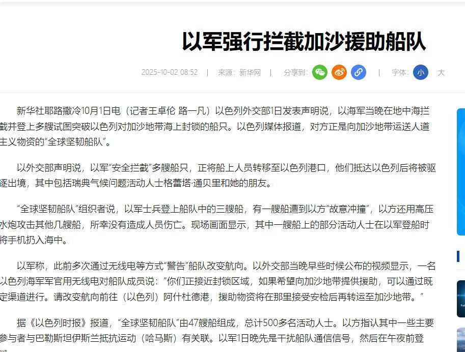 以色列向“全球坚韧船队”开炮,北约护航失败,美紧急增兵中东! 西班牙出动军舰、土耳其出动无人机为向加沙提供救援的全球坚韧船队护航,但还是挡不住来自以色列的海军的强势拦截。英国广播公司(BBC)2日报道,以色列海军在距离加沙海岸线70海里的海面强势拦截了全球坚韧船队的主力船只,包括通贝里所在的“阿尔玛”号,以及包括另外2艘主力船“苏里乌斯”号和“阿达拉”号。 土耳其的无人机在空中盘旋,只能眼睁睁看着以军登船。北约这所谓的“护航”,从头到尾就是个摆设。 登船过程里,以军一点没客气。他们用高压水炮喷射船只,还有一艘船遭到了蓄意冲撞。船上的活动人士急了,只能把手机往海里扔,怕被搜走证据。 有段视频特别戳人,船员们围成一圈唱起了反法西斯歌曲《啊,朋友再见》,歌声里全是无奈。这场景,比直接冲突更让人难受。 整个拦截行动持续了12个小时。以军先控制6艘大船,再收拾小船,41艘船全被拖往以色列的阿什杜德港,400多人成了俘虏。 以色列总理内塔尼亚胡第二天就出来邀功,说这行动阻止了船只“进入战区”。以外交部更理直气壮,宣称拦截“合法”,还说船队和哈马斯有关联。 他们甚至给船队指了条“明路”,让去阿什杜德港接受安检再转运物资。这话谁信?加沙缺粮缺药都快撑不住了,哪耗得起这时间。 北约那边彻底没了声音。西班牙军舰全程围观,事后只敢召见以色列临时代办做做样子。土耳其骂得最凶,说以军是“恐怖主义行为”,却也没实质动作。 这拦截一搞,全世界都炸了锅。德国柏林、法国巴黎、土耳其伊斯坦布尔的民众全走上街头抗议。联合国人权特别报告员直接定性,说这是违反国际法的行径。 哥伦比亚总统气得直接驱逐以色列全部外交人员,还撕毁了两国的自由贸易协定。南非、卡塔尔、比利时也跟着谴责,要求立刻放人。 哈马斯更狠,直接骂以军是“海上海盗”,说这是针对平民的恐怖主义犯罪。组织者也怒了,说以色列就是怕封锁政策被戳穿,才对和平援助下狠手。 有意思的是,以军嘴上喊着“安全拦截”,却把人全扣了下来,说要驱逐出境。通贝里当场反驳,直言这就是针对人道主义行动的打压。 这边骂声还没停,美国那边又传消息。五角大楼宣布紧急增兵中东,说是为了“稳定地区局势”。明眼人都看得出来,这是在给以色列撑腰。 可增兵真能解决问题吗?未必。以色列这次在公海动手,已经把自己架在了国际舆论的火上烤。越来越多国家开始质疑它的封锁政策合法性。 那些被扣押的人里,有议员、律师、普通活动人士,来自几十个国家。各国的追责压力,正一波波砸向以色列。 更讽刺的是,以军拦截的是救援物资,堵的是加沙民众的活路。国际社会早就呼吁解除封锁,以色列却用军舰说话,这反而坐实了外界对它“人道主义犯罪”的指控。 土耳其检方已经立案调查,要追究扣押土耳其公民的责任。西班牙也在统计本国65名参与者的情况,后续的外交博弈少不了。 现在再看这场闹剧,北约的脸算是丢尽了。说好的护航护不住船队,反而让以色列的强硬气焰更盛。美国急着增兵,更像是在给盟友擦屁股。 “全球坚韧船队”虽然没把物资送进去,但它戳破了两个假象。一个是北约的“保护罩”根本靠不住,一个是以色列所谓的“合法封锁”站不住脚。 船上的人或许会被驱逐,但这场行动已经引发了连锁反应。越来越多人开始关注加沙的困境,以色列的孤立感正越来越强。 美国的增兵命令已经下达,中东的军事存在又要加码。可子弹挡不住舆论的追问,军舰也解不开加沙的人道主义困局。 这场地中海的拦截战,说到底是一场道义和强权的碰撞。以色列赢了当下的拦截,却可能输掉长远的信任。美国的增兵,更像是在给这团乱麻再缠上一圈线。 后续会怎么发展?没人说得准。但可以肯定的是,这40多艘被拖走的船,会成为中东乱局里又一个解不开的结。 信源:新华网《以色列拦截加沙援助船队,多方表示谴责》