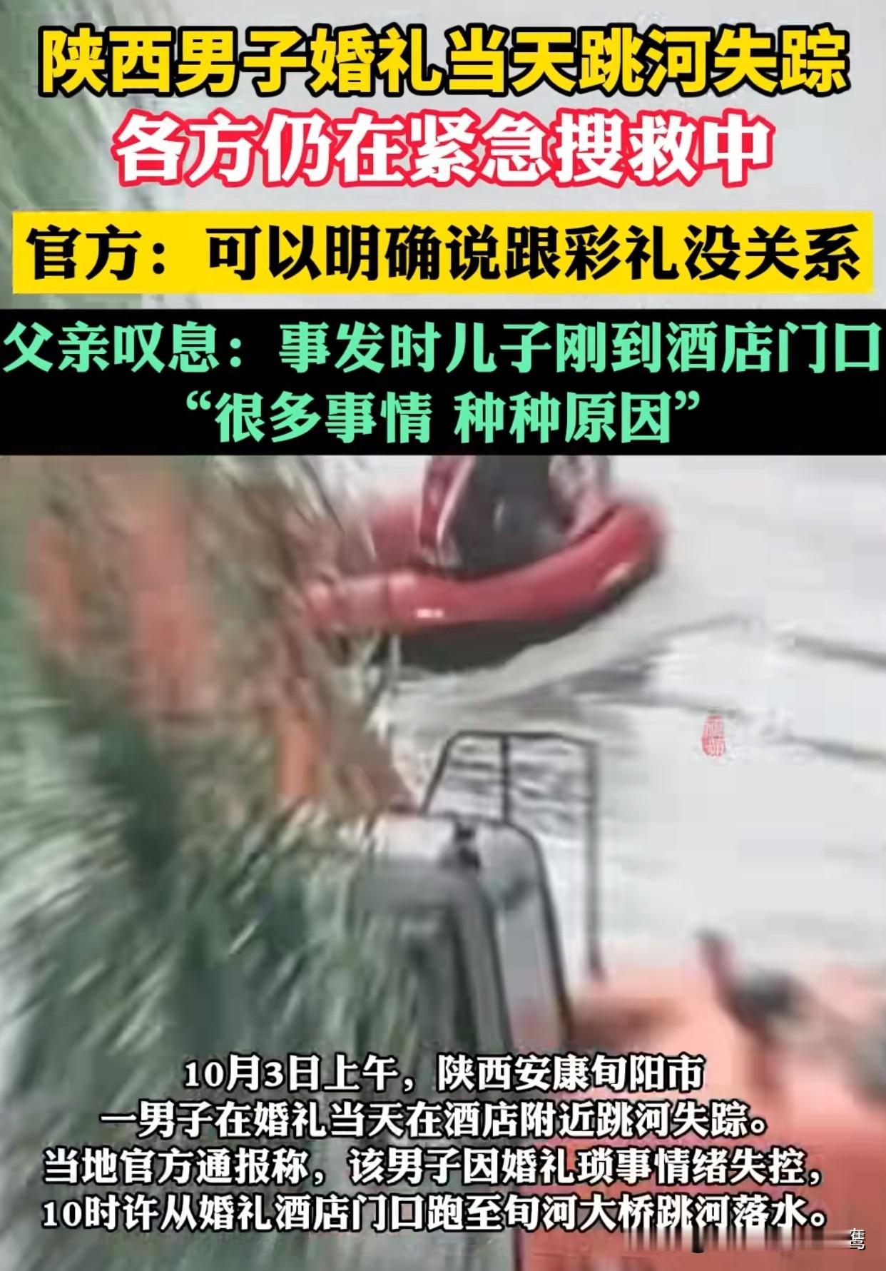 结婚当天新郎跳河失踪了,他父亲说不是因为彩礼闹的,而是各种事情凑在一起导致的。说真的,听到这个事我心里特别难受。 要我说,结婚遇到问题太正常了,要是真走不下去,大不了这婚就不结了。我觉得再怎么着,也不能走绝路啊。他这一跳倒是解脱了,可把一辈子的痛苦都扔给了父母,这真的太让人心疼了。 现在很多人面对压力时,连一句“不结了”都说不出口。说实话,这正说明心理防线已经彻底崩溃了。其实走到这一步之前,他可能已经发出过很多求救信号,只是没人注意到。 生命比任何婚约都重要。好好爱自己,才是对家人最大的负责。