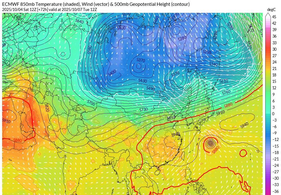 【副热带高压持续强势】最新的数值预报把冷空气的时间又调后了,调到了16号左右,副热带高压强度调强,5940控制江浙沪,5910几乎控制整个南方地区,这在环流上是今年最强的副热带高压,幸好现在是10月,不是8月,不然肯定会有大片38度的区域 最近冷空气不南下,主要是因为我国的西风带太平直,经向度不够,冷空气只好在蒙古和西伯利亚地区徘徊堆积,不过一旦抓住机会就会爆发南下的。