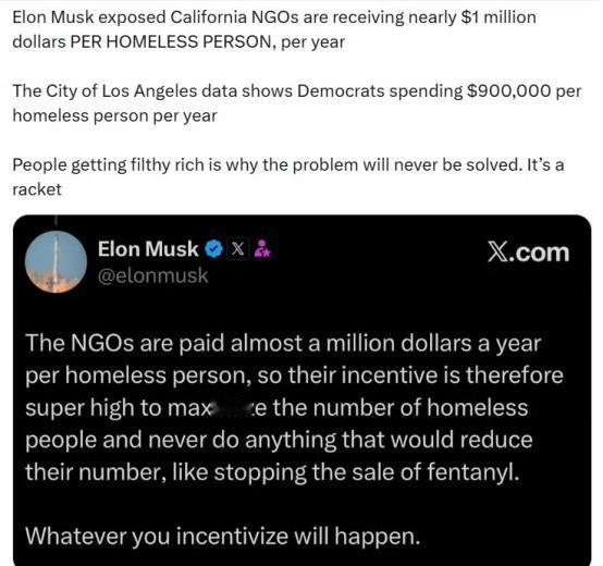 埃隆·马斯克揭露,加州的一些非政府组织每年为每一名无家可归者获取将近100万美元的资金。 洛杉矶市的数据表明,民主党人每年在每名无家可归者身上花费90万美元。 有人借此大发横财,这就是为什么这个问题永远不会被解决——这是一门“生意”。 要理解这场生意的运作逻辑,2016年洛杉矶通过的HHH提案是最好的切入点。 当时选民以压倒性多数同意提高房产税筹集12亿美元,计划建造1万套无家可归者公寓。 然而六年过去,实际建成的单元仅3357个,更惊人的是审计发现在建单元平均成本高达59.6846万美元,部分高端项目甚至超过70万美元,这个价格远超丹佛等同类城市的商品房中位售价。一套面积不足40平米的保障性住房,为何能卖出豪宅价? 答案藏在项目审批和建设的各个环节里。加州严苛的环保法规要求开发商必须采用特殊建材,而这些材料的供应商大多与当地建筑工会存在深度绑定; 项目设计必须包含"文化敏感性咨询",这笔费用通常落入指定的少数族裔机构口袋;甚至连施工期间的"社区沟通会"都要支付给第三方公关公司高额报酬。 洛杉矶审计局2022年的报告显示,HHH项目中直接用于住房建设的资金仅占43%,其余部分都消耗在各类"配套服务"和行政开支上。 非政府组织(NGO)在这场利益分配中扮演着关键角色。洛县2023-24财年预算中,有2550万美元专门用于"与当地司法管辖区合作解决营地问题",这些资金大多通过招标方式流向合作NGO。 但诡异的是,中标机构往往是那些成立时间短、资质普通却与 county 官员有着千丝万缕联系的组织。 一家名为"希望之家"的NGO在2023年获得了1200万美元合同,负责运营临时住房项目,但其公开财报显示员工工资支出占比高达78%,远超同类公益组织的薪酬水平。 更讽刺的是,该组织运营的住房项目因管理混乱,入住率始终不足50%,却能每年顺利通过绩效评估并获得资金续期。这种"拿钱不办事"的模式在加州并非个例,因为这些NGO本质上是资金流转的"白手套",它们的存在让公共资金合法化地流入利益集团的腰包。 资金的浪费还体现在服务体系的层层转包上。洛县预算中提到的"22130个永久性支持性住房单元",实际上并非由政府直接运营,而是通过"购买服务"的方式委托给第三方机构。 这些机构再将具体服务分包给更小的组织,每经过一层转包,服务成本就会增加15%-20%。 以心理健康服务为例,政府给一级机构的拨款标准是每人每月800美元,经过两次转包后,最终提供服务的基层诊所只能拿到350美元,为了盈利只能减少服务频次和质量。 2023年洛杉矶时报的调查发现,全县有超过30%的无家可归者心理健康服务资金,最终流向了与县议员有亲属关系的企业。 这种"官僚-NGO-企业"的利益共同体,形成了一个自我强化的闭环:资金越多,中间环节分得的利润就越多,而真正需要帮助的无家可归者却始终处于这个链条的最末端。 民主党主导的政策设计更是为这门生意提供了制度保障。加州法律规定,无家可归者住房项目可以享受 property tax 减免和 developer fee 豁免,这使得开发商在拿地阶段就能获得巨额利润。 同时,为了"政治正确",项目必须设置一定比例的"优先入住权"给LGBTQ+群体、原住民等特定群体,这导致大量符合条件的无家可归者无法获得住房,而部分机构则利用这种配额制度进行"资格造假",将住房分配给不符合条件的关系户。 更关键的是,加州禁止地方政府清理街头露营地,除非能提供"等量的室内床位",这一政策看似人道,实则为NGO索要更多资金提供了借口——只要街头还有流浪者,就说明需要更多预算来建造床位,而这些床位建成后是否真的被使用,却无人关心。 最具讽刺意味的是,在资金投入不断创纪录的同时,加州的无家可归者人数却在持续增长。2016年HHH提案通过时,洛杉矶无家可归者约2.8万人,到2023年已增至4.2万人,七年增长50%。 Skid Row地区的帐篷营地从2018年的800多个扩张到2023年的2300多个,街头毒品交易和暴力犯罪率飙升。 但这并不影响利益集团的赚钱节奏,反而成为他们要求增加预算的理由。 洛县监事会主席Janice Hahn在2023年预算听证会上说:"我们需要更多资金来应对日益严重的危机",这句话完美诠释了这场生意的核心逻辑——问题永远不能被解决,一旦解决了,资金流就会中断,整个利益链条都会崩塌。 马斯克的说法或许存在数据夸大,但他确实点破了加州无家可归问题的本质。当一项社会问题被转化为持续产生利润的产业时,所有参与者都会不自觉地维护这个系统的存在。