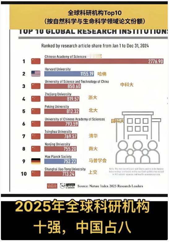根据自然科学与生命科学领域的论文份额,在刚刚发布的全球科研机构10强榜单上,中国的机构独占8席。我记得,一些人口口声声中国的基础科学不行,现实情况好像与他们说的不一样哎。 说白了,一个能把工业制造业做到全球第一的国家,基础科学怎么可能真的落后? 就像盖大楼,没有扎实的地基撑不起摩天大厦,制造业的腾飞背后,必然是基础研究在默默托底,只不过很多人没意识到这种支撑关系有多紧密,也忽略了科学成果从发现到应用往往存在着时间差。 先看看那些实实在在的成果吧。 2025年8月,中国科学技术大学潘建伟团队刚刷新了中性原子量子计算系统的世界纪录,用人工智能技术在60毫秒内构建出2024个原子的无缺陷阵列,单比特门保真度达到99.97%,双比特门保真度99.5%,这可是直接追平了美国哈佛大学的国际最高水平。 要知道量子计算被称为下一代计算革命的核心,这种基础层面的突破可不是靠“拿来主义”能实现的,背后是无数次实验数据的积累和理论模型的迭代。 再说说贵州的FAST天眼,截至2024年11月,它发现的脉冲星数量已经突破1000颗,超过同一时期国际其他望远镜的总和,还捕捉到了纳赫兹引力波信号的初步证据,这些成果让中国在射电天文领域的话语权大幅提升。 脉冲星观测不仅能检验广义相对论,还能为探测引力波提供关键数据,这些都是纯粹的基础科学研究,哪一项拿出来不是世界级的突破? 有人可能会说论文数量不代表质量,但看看具体的引用数据就知道了。 2025年3月科睿唯安的ESI数据显示,南开大学化学学科首次进入全球前万分之一,过去11年发表的11572篇论文累计被引367251次,篇均引用率31.74次,在全球前万分之一机构中排第8位,中国第3位。 更关键的是,2024年南开以第一作者或通讯作者在化学顶尖期刊JACS和ANGEW发表论文225篇,名列全球第3位。顶尖期刊的发表数量和引用率,直接反映了研究成果的国际认可度,这可不是靠数量堆砌能得来的。 再说说工业制造业和基础科学的关系。中国现在是全球唯一拥有完整工业体系的国家,从高铁到5G,从新能源汽车到航天工程,每一个领域的突破都离不开基础研究的支撑。 就像高铁的轴承钢,要在高速运转中保持稳定,就需要材料科学对金属晶体结构的深入研究;5G通信的毫米波技术,依赖于电磁场理论和微波物理的基础探索。 2023年中国GDP已经达到129.4万亿元,虽然2024年的研发投入占比数据还没完全公布,但从2018到2023年的增长趋势来看,这个数字一直在稳步提升。 要知道,美国在二战后崛起时,也是先通过大规模工业生产积累资本,再反哺基础科学研究,中国现在走的正是这条符合规律的道路,只不过速度比当年的美国快得多。 至于所谓的“滞后性”,看看诺贝尔奖就明白了。现在很多获奖成果都是几十年前的研究,比如2023年诺贝尔物理学奖授予的阿秒光物理,其基础理论研究早在20世纪90年代就开始了。 中国真正大规模投入基础科学研究也就是最近十几年的事,现在看到的这些成果,其实是前十年投入的回报,而现在正在进行的研究,可能要到十年后才能真正显现价值。 就像潘建伟团队的量子计算研究,从最初的几原子系统到现在的两千原子阵列,用了整整十五年;FAST天眼从立项到建成用了22年,这些都不是一蹴而就的。 那些说中国基础科学不行的人,要么是抱着老黄历不放,要么是故意忽略事实。 他们没看到中国在科研设施上的投入,比如正在建设的FAST核心阵,要在周边加建24台40米口径望远镜,把分辨率再提升一个数量级;也没看到年轻科研人员的成长,现在中国在国际顶尖期刊发表论文的第一作者平均年龄越来越年轻。 基础科学研究从来不是短跑,而是马拉松,中国现在不仅跑在了第一梯队,而且后劲十足。 当然,我们也没必要妄自尊大,和欧美顶尖水平相比,在某些基础理论领域还有差距,但这种差距正在以肉眼可见的速度缩小。 关键是要明白,评价一个国家的基础科学实力,不能只看过去的成就,更要看现在的投入和未来的潜力。 全球科研机构10强占8席,这只是一个开始,随着时间的推移,当今天这些“正在进行时”的研究转化为“过去完成时”的成果时,人们会更清楚地认识到,中国的基础科学不仅不是不行,而是正在迎来爆发期。 那种“中国基础科学不行”的论调,迟早会像旧时代的残响一样,被越来越多的事实所淹没。