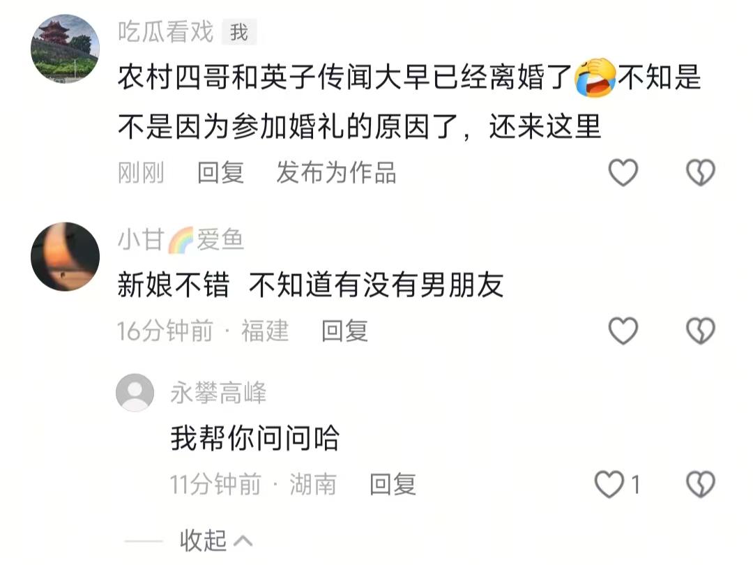 现在全网最后悔的男就是农村四哥了吧! 不是因为拍视频没人看也不是因为带货没人买而是因为去小朱大婚,给人拍到跟英子同框,被追问是不是跟英子分开了,这个怎么回答? 说实话,我蹲农村四哥的视频蹲了仨月,就为等王四和小英子同框——之前俩人各拍各的,评论区吵得稀里哗啦,说啥“过不下去”的都有,我郁闷得连他们带的玉米碴子都没心思买!结果小朱大婚的视频一出来,嘿,俩人居然坐一桌上了,一家五口整整齐齐,我当时激动得差点把手里的粥撒了,这场景比看连续剧大结局还过瘾,Hurray! 本来想仔细瞅瞅俩人状态,毕竟仨月没同框了,结果摄影师跟怕碰着啥似的,镜头一扫就过,停留不到三秒,我晕!这跟吃火锅刚夹着肉就掉锅里有啥区别?我倒回去扒拉了四遍,才确认那真是小英子,桌上还摆着农村宴席常见的梅菜扣肉呢,不是吧?就不能多拍两秒让咱看清楚点?咋整啊这是,吊人胃口也不是这么吊的! 之前我在粉丝群里跟人抬杠,说“肯定是误会,俩人就是想分开拍内容”,结果有人截了俩人俩月没同框的截图打我脸,当时我都快崩溃了,觉得自己跟个潮巴似的,稀里哗啦退了群。直到这次同框视频出来,群里又炸了,有人喊“太棒了!终于等到了”,有人却还在问“为啥不一起拍视频?给个准话很难吗”,说实话,我也纳闷,要是真没事,回应一句不就搞 掂了? 我妈前阵子跟我说,别人常讲“缘分像晒谷子,得顺着天来,急不得”,俩人各拍各的,说不定是想搞点新花样,总不能一辈子绑一块儿拍农活吧?本来我还觉得这话在理,结果上周刷到小英子的视频,有个老粉留言“之前买你家红薯干,就是冲你家实在日子,现在连话都不跟粉丝说,以后不买了”,我心里咯噔一下——这不就是我想说的吗?粉丝追着看,不就是图个真实?现在倒好,话都不说,这也太让人膈应了! 本来想再也不蹲他们视频了,觉得没意思,结果上周刷到王四拍小朱婚礼的花絮,里面有个镜头扫到小英子给孩子夹菜,动作挺自然的,我又有点动摇了——或许人家就是不想把家里事放网上说?之前我跟我闺蜜闹别扭,憋了半个月没说话,后来一聊天才知道是误会,你看,说开了不就没事了? 有次我在评论区留“要不你们就说句‘一切都好’,省得大家猜”,结果居然有人给我点赞到99+,还有人私我说“终于有人说出我的心里话了”,当时我还挺惊讶,原来不是我一个人困惑啊!其实吧,不管是网红还是咱普通人,做事跟过日子一样,别让人猜来猜去,猜来猜去的功夫,人心都凉了,你说对不? 总之,我现在也佛系了,他们更不更、同不同框,随便吧,反正农产品哪儿买都行。但作为蹲了两年的老粉,还是想劝一句:四哥啊,粉丝追你,不是追你家的瓜,是追当初你和英子一起扛锄头、做饭的那股子实在劲儿。 要是觉得私人生活不想说,就大大方方说“咱想分开拍内容,谢谢关心”;要是有啥别的事儿,也不用藏着掖着,大家都不是傻子。你看那些一直火的网红,不都是跟粉丝处得像朋友似的?别到最后粉丝都走光了才后悔,那时候再想挽回,可就难喽!你说是吧!