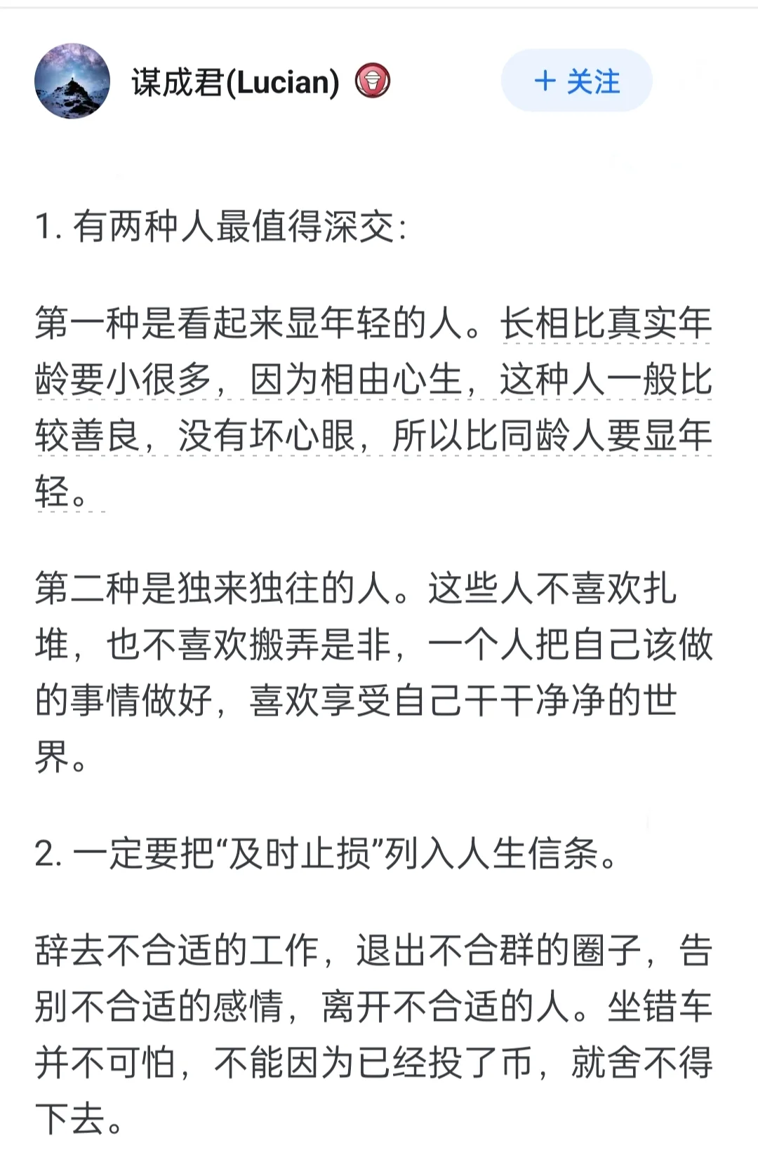 能在人生的关键节点做出了正确的选择。 聪明人都说自己运气好。 事成=人谋+天成 聪明人已经习惯谋,成不成真看运气。 ❤️❤️❤️ 我是悠然,愿我们都能有悠然自得的人生~