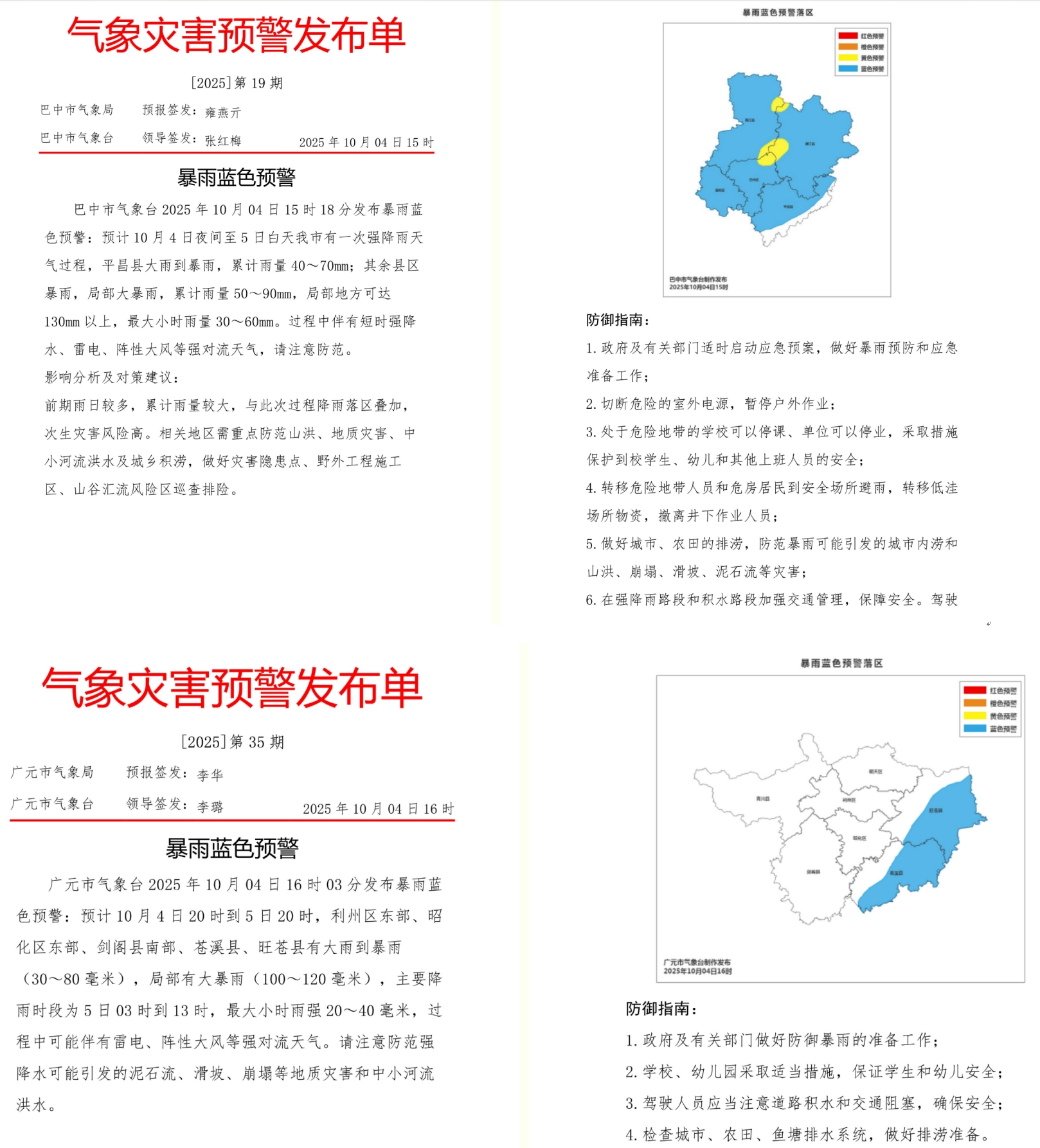 在四川的朋友们注意啦,目前,巴中、广元两市的暴雨蓝色预警正在生效中。