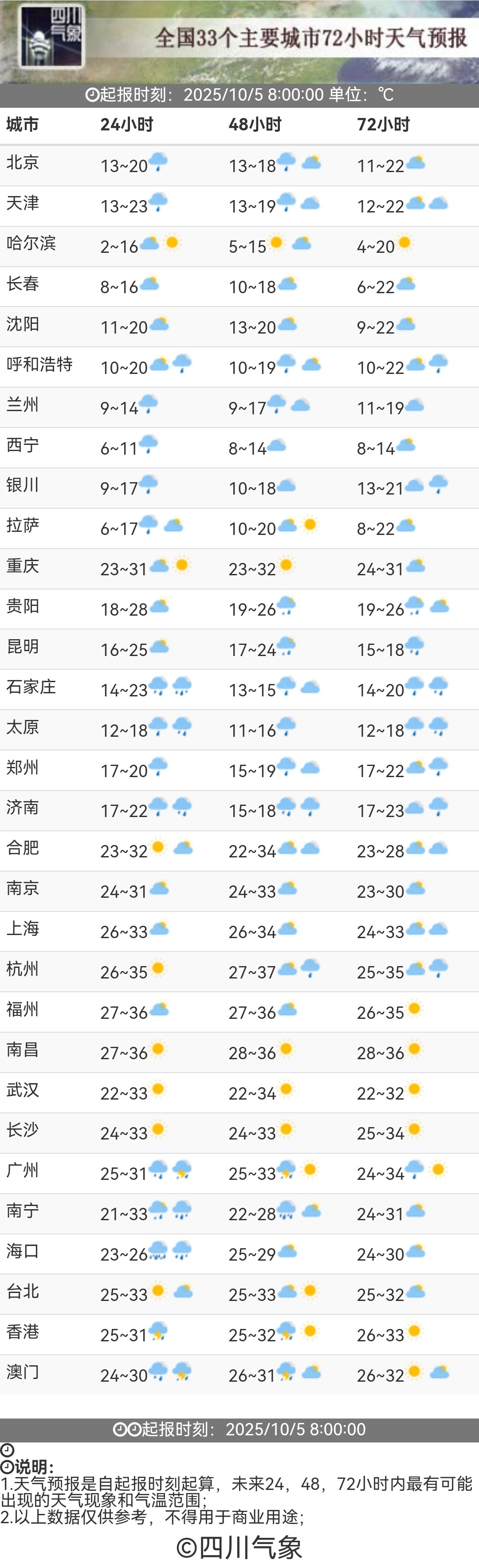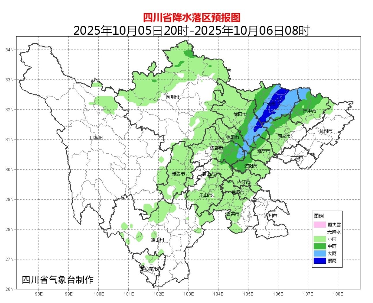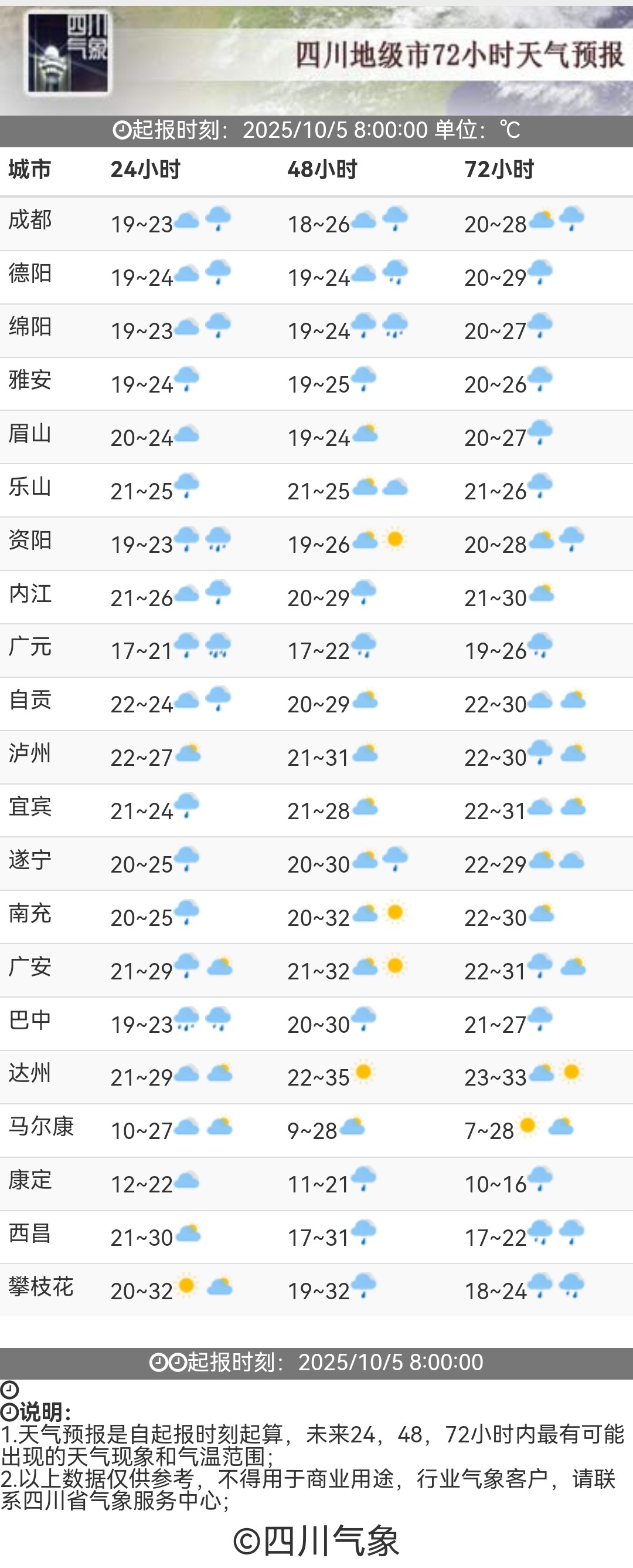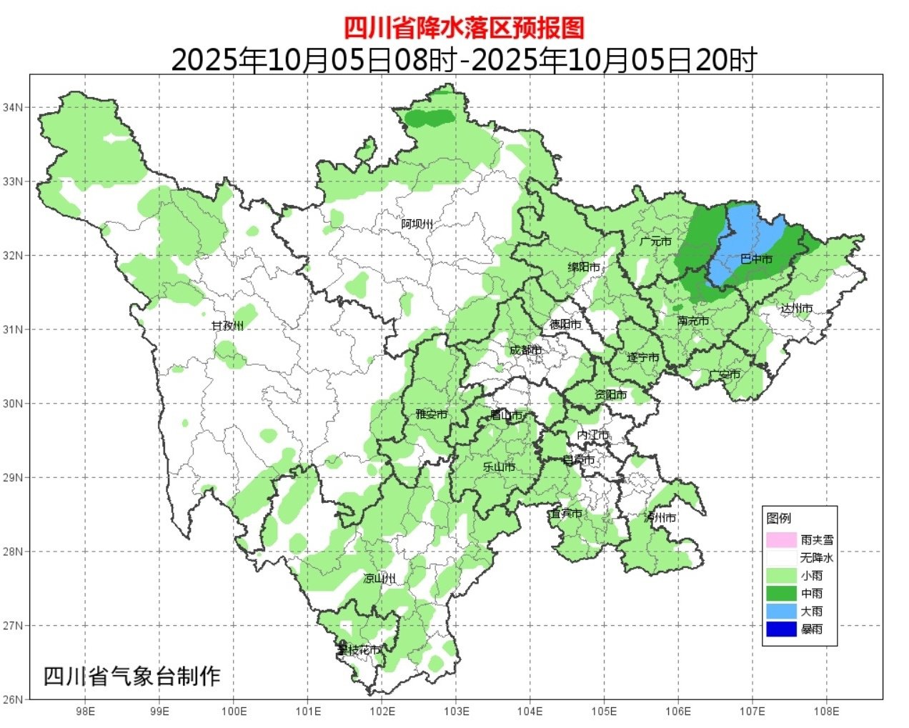据四川省气象台今天(10月5日)早间最新预报,5日至7日,盆地多阵雨或小雨,其中盆地北部有中到大雨,局部暴雨,部分地方强降水落区与前期多重叠,累积雨量较大;川西高原和攀西地区多阵性降水。