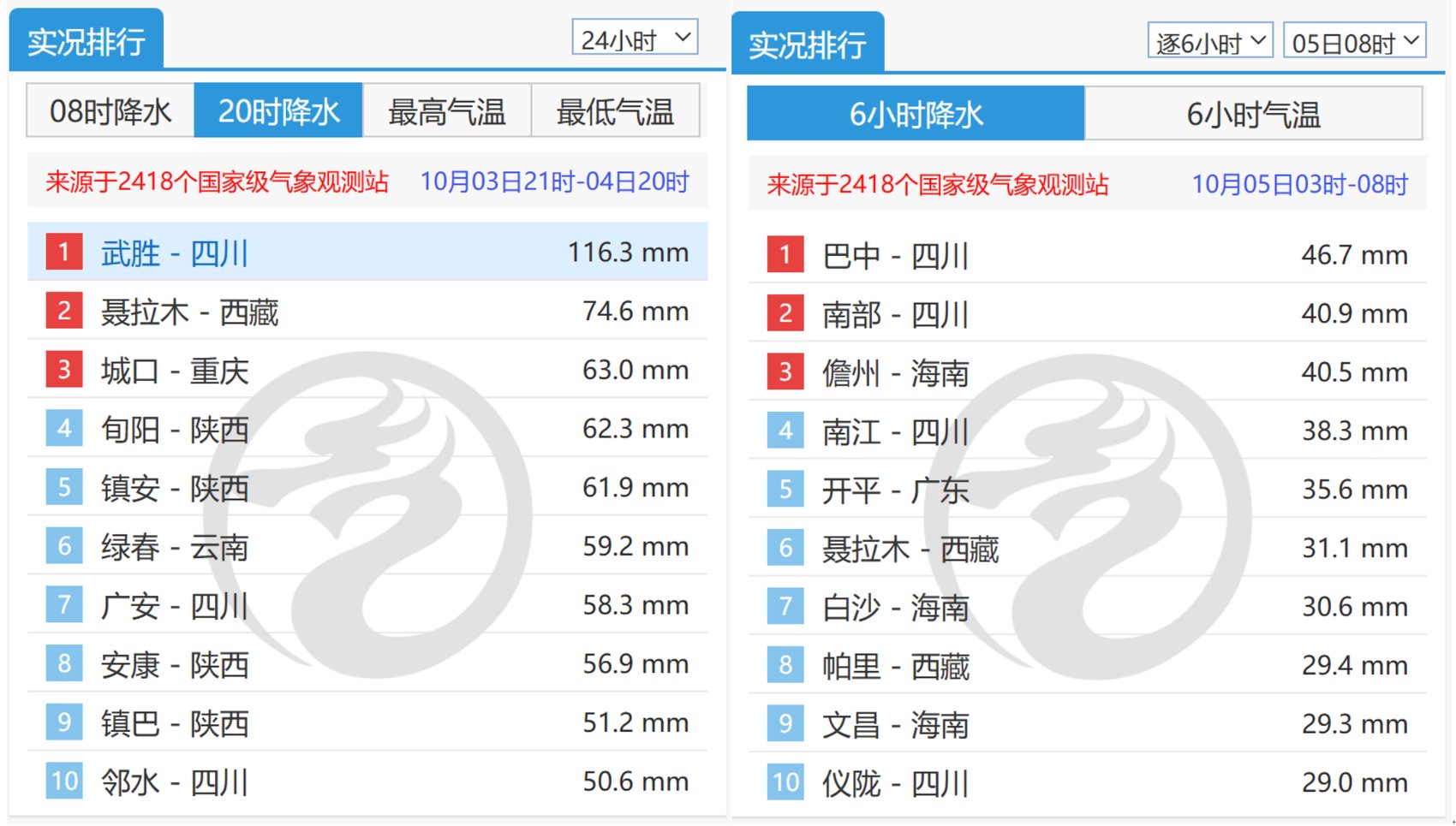 国庆以来,四川盆地东北部多降水。10月3日21时至4日20时,武胜、广安、邻水3站登上全国24小时雨量排行榜,分别居于第1、7、10位;在过去6小时里,巴中、南部、南江、仪陇又分别拿下全国雨量排行榜的1、2、4、10位。