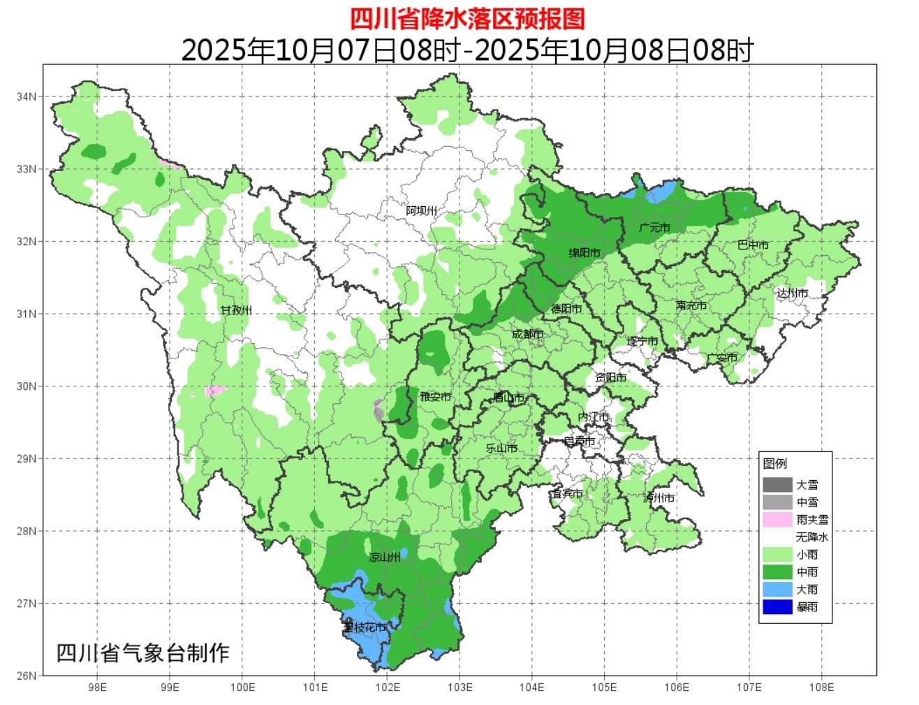 7日白天到晚上,广元、绵阳、德阳、成都、雅安、巴中6市阴天间多云部分地方有中雨,局地大雨,盆地其余地方多云间阴有分散阵雨;川西高原和攀西地区阴天间多云有分散阵雨(雪),其中攀西地区局部有中到大雨。