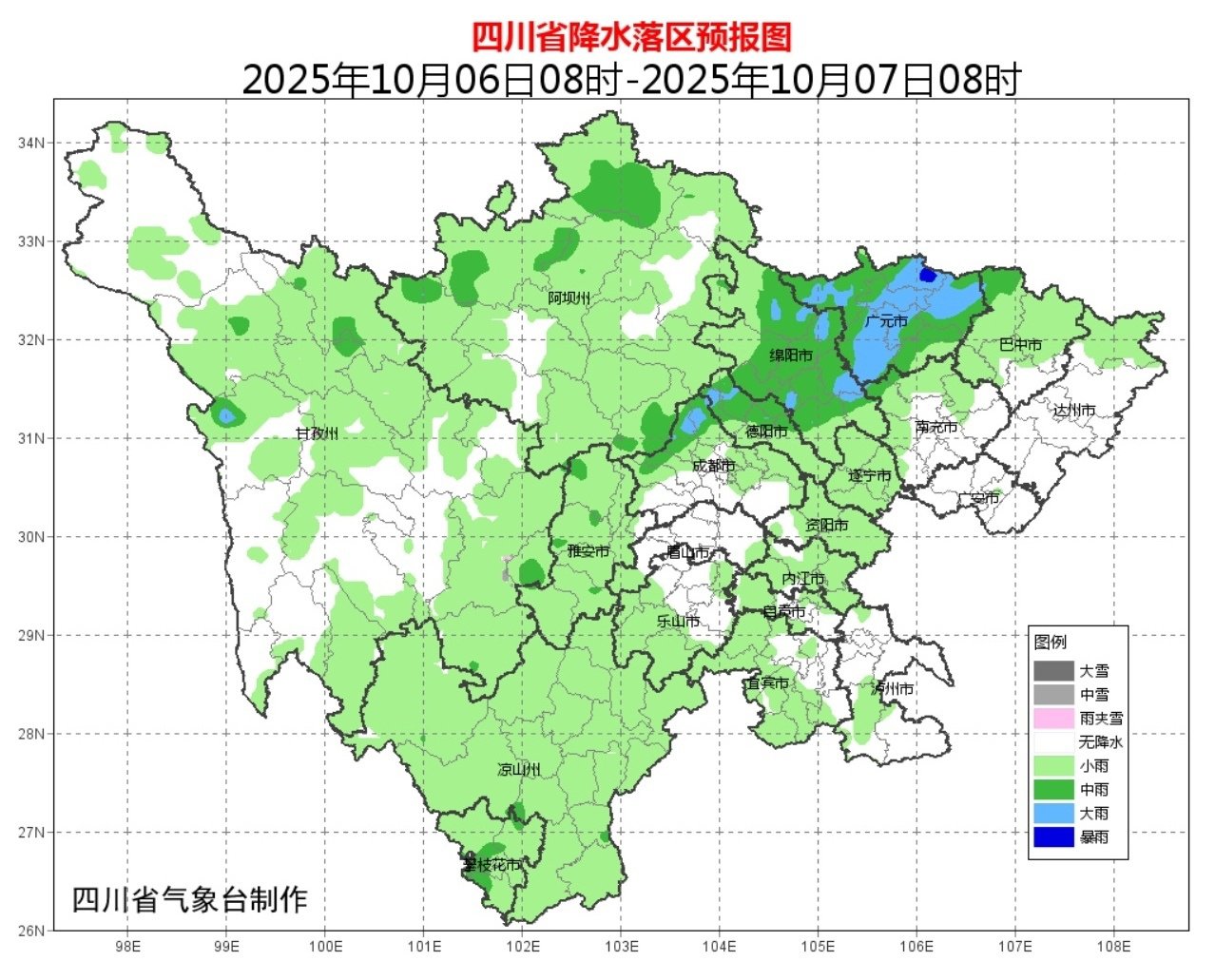 6日白天到晚上,广元、绵阳、德阳、成都、雅安、眉山、乐山7市阴天间多云有阵雨或小雨,局部有中到大雨,盆地其余各市多云间阴有分散阵雨;川西高原和攀西地区多云间阴有阵雨(雪),局部中雨。