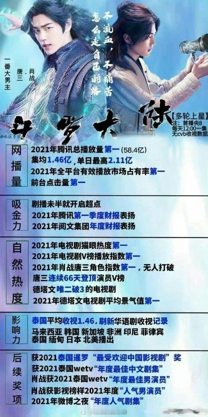 谁还不知道,让鹅厂开启“超前点播”时代的是肖战的大爆剧《陈情令》啊,光超点总营收就达1.6亿,历史第一!还有播放量破50亿的《斗罗大陆》更让鹅赚的钵满盆满。