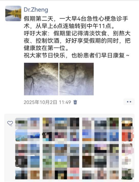 “假期第二天,一大早4台急性心梗急诊手术,从早晨6点连轴转到中午11点。呼吁大家,假期里记得清淡饮食,别熬夜,控制饮酒,好好享受假期的同时,把健康放在第一位……”10月2日中午,浙江省人民医院心内科副主任郑浩主任医师发了这样一条朋友圈。