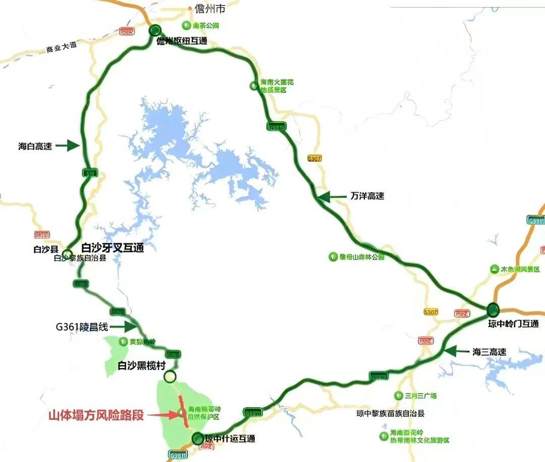受台风“麦德姆”强降雨影响,G361陵昌线琼中段K130+150至130+175段右幅、K130+870至K130+920段右幅出现边坡滑坡、路基掏空及路面沉陷,存在通行安全风险,为确保人民群众生命财产安全,经交警部门同意,决定自2025年10月5日13:00起,对G361陵昌线K127+200至K138+100段实施临时全幅封闭管制,琼中往返白沙方向的车辆绕行:什运互通⇄海三高速⇄岭门互通⇄万洋高速⇄儋州枢纽互通⇄海白高速⇄牙叉互通⇄白沙元门黑榄村。