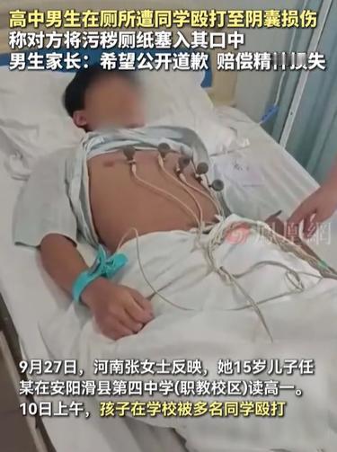 有其母必有其子!河南安阳,高一男生晚上想睡觉,可对门的宿舍还在吵,他就喊了一声,让他们不要吵了,结果第二天,9月10日,他们把男生叫到厕所,十几个学生前后夹击男生,男生被打得满嘴流血,他们还将一团带着屎尿的厕纸塞到他嘴里,男生妈妈找对方讨说法,不料,打人学生妈妈却说:男生骂人在先,这不是校园暴力,只有男生没错,被打才算。 9月9日晚上,安阳某高中学校熄灯铃响过后,大部分学生都准备入睡,可偏偏有个宿舍还在闹腾,说话声、打闹声此起彼伏,隔壁宿舍的高一男生任同学翻来覆去睡不着,实在受不了了,就朝走廊喊了句:能不能安静点,都几点了。 就这么一句话惹了大麻烦,第二天上午,任同学正准备去上课,突然有人跑来说厕所有人找他,他还以为是什么急事,结果刚踏进厕所门,就被人从背后推了个踉跄,还没站稳十几个人就围了上来,拳头雨点般落在他身上。 任同学被打得鼻血直流,嘴角开裂,整个人蜷缩在地上,可这帮人还不解气,其中一个居然从便池里抓起沾满污物的厕纸,硬往任同学嘴里塞,那股恶臭让任同学当场干呕,差点窒息过去。 整个过程持续了十多分钟,直到有路过的同学发现不对劲,赶紧跑去告诉老师这场暴行才停止,任同学被送到医院时,医生都惊呆了口腔多处撕裂,头部多个血肿,胸腹部软组织挫伤,连生殖器官都受了伤。 这事很快在学校传开了,任同学的母亲气得浑身发抖,找到学校要求严肃处理,可让人意想不到的是,其中一个施暴学生的家长竟然振振有词:是你儿子先骂人的,孩子们只是教训教训他,这哪算校园暴力,要是他一点错都没有被打了,那才叫暴力。 这番话简直刷新了人们的认知底线,按这个逻辑只要找到一点理由,就可以对同学大打出手,那学校岂不成了弱肉强食的丛林? 事件在网上曝光后,引发了铺天盖地的讨论,一位从事青少年心理辅导的专家表示:往受害者嘴里塞污物,这已经不是简单的肢体冲突,而是极端的人格侮辱,这种行为会给受害者造成严重的心理创伤,可能需要很长时间才能恢复。 据了解类似的校园暴力事件并非个案,近年来校园欺凌事件呈现低龄化、群体化的趋势,而家长的态度往往决定了事件的走向,包庇纵容只会让施暴者变本加厉,认错改正才是正确的教育方式。 目前当地教育部门已经介入调查,涉事学生面临严肃处理,任同学的家人也表示将通过法律途径维权,要求施暴者公开道歉并承担相应责任。 这起事件给所有人敲响了警钟,学校需要加强管理,建立有效的矛盾调解机制,家长要树立正确的教育观不能一味护短,学生之间更要学会相互尊重,用文明的方式解决问题。 只有各方共同努力,才能让校园真正成为孩子们安心学习、健康成长的净土,否则今天的施暴者,明天可能就会成为社会的隐患,这个教训值得每个人深思。 麻烦看官老爷们右上角点击一下“关注”,既方便您进行讨论和分享,又能给您带来不一样的参与感,感谢您的支持!
