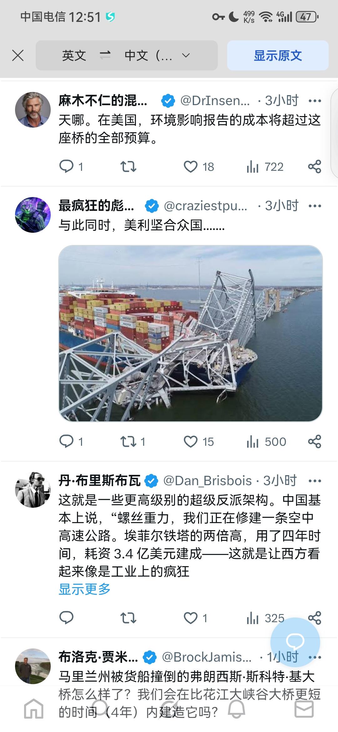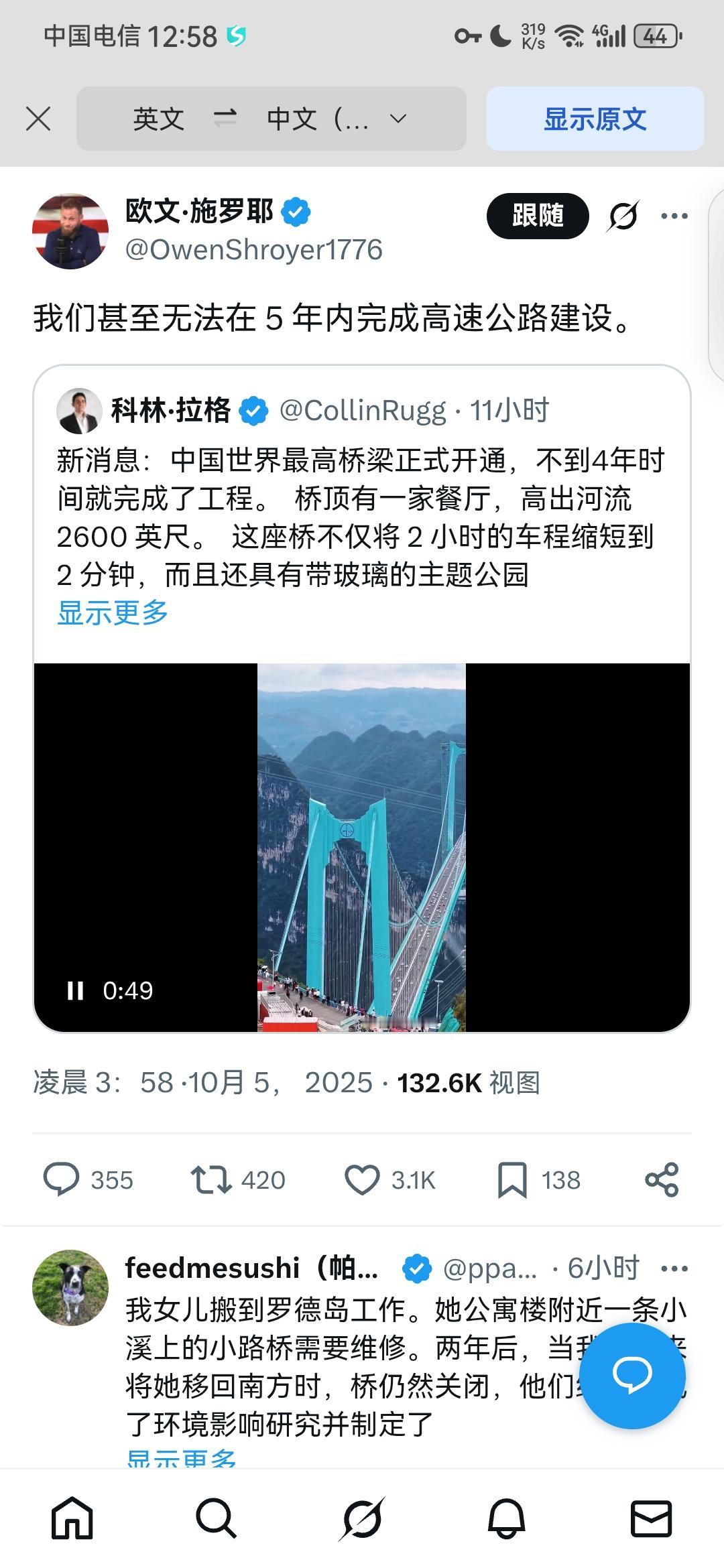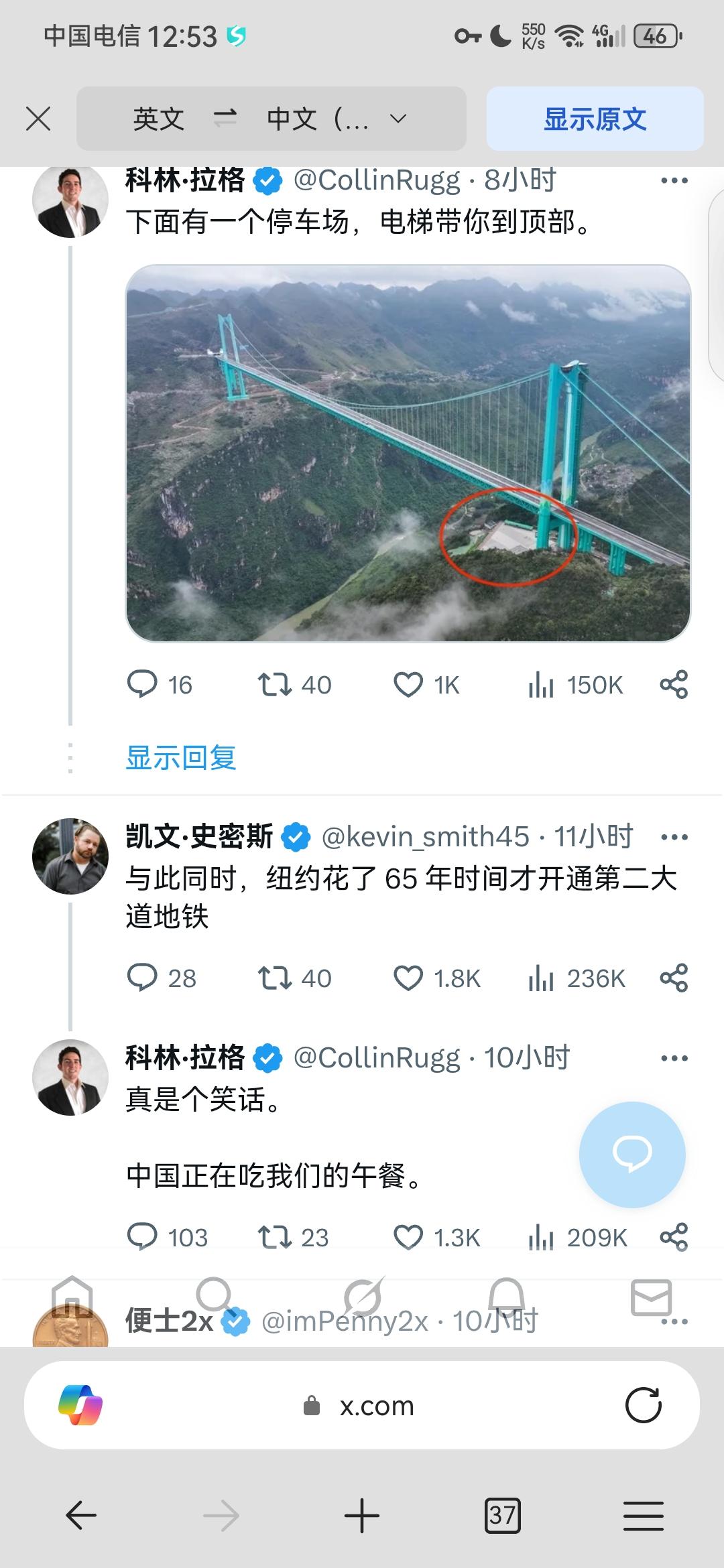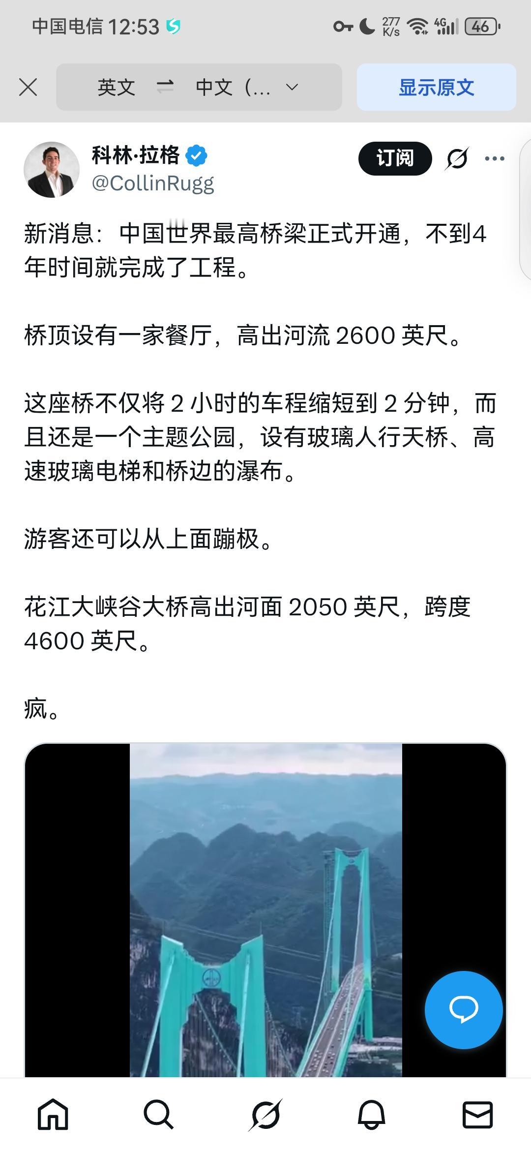 贵州的花江峡谷大桥竟然在外网火了!10月5日,推特著名大V马里奥·诺法尔以非常热情的语气赞叹说道:“中国刚刚建了一座桥,高到基本上都触及云层!” “这座桥,是贵州的花江峡谷大桥,大桥高出谷底625米,是埃菲尔铁塔的两倍,它将两小时的车程缩短到2分钟,同时还兼做主题公园,设有蹦极、玻璃人行天桥,甚至还有空中餐厅。” “它耗资更是只有3.4亿美元,在不到四年的时间就建成了。” 这条推特下面,还配了一个花江峡谷大桥的视频,从视频之中可以窥见这条大桥的雄姿,推特发出之后,立刻在外网火了,美国人更是纷纷在推特下面留言,表达自己的震撼与歆羡。 同时,更加引人注目的,还是很多美国人,开始对比中国与美国的基建情况,纷纷开启辛辣嘲讽美国的模式,有的说:“在美国,环境影响报告的成本将超过这座桥的全部预算”。 有的辛辣道:“马里兰州被货船撞倒的弗朗西斯·斯科特·基大桥怎么样了?我们会在比花江峡谷大桥更短的时间(4年)内建造它吗?” 还有的嘲讽美国道:“与此同时,纽约花了65年时间才开通第二道大地铁”,“我们甚至无法在5年内完成高速公路建设”。 花江峡谷大桥,创造了两个世界第一,首先是世界最高大桥,其次是世界居山区桥梁跨径第一的世界第一长的大桥,横竖都是世界第一。 这样震撼性的成就,再一次震撼了世界,让所有人见识到了我们的基建力量。 而这样的成就,更是让欧美国家很多人都羡慕不已,因为他们国家的基建情况已经越来越糟糕,各种设施变得陈旧不说,基建效率也变得无比低下,不管是建造什么,都慢的吓人。 这种“慢悠悠”,“拖拖拉拉”的速度,在以往的公知的描述中,是一个优点,但现在随着社交媒体越来越发达,我们也终于知道了欧美普通民众真实的心里想法。 他们是真的羡慕! 同时,对于他们国内糟糕的基建速度,深恶痛绝。 比如说这一次花江峡谷大桥的通车,就让很多美国人开启辛辣嘲讽美国的模式,那种对美国基建状况“恨其不争”的情绪已经快要溢出屏幕。 或许,这也是花江峡谷大桥在外网火爆的一个根本性原因,毕竟两者对比实在是太过鲜明,让人根本无法忽略。 只能说,时移世易了。 曾几何时,我们看着欧美的高楼大厦,羡慕不已,但现在,轮到欧美民众看着我们的一项又一项成就,歆羡无穷了。