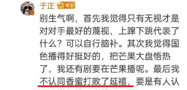 虽然我也不是很喜欢于正的一些狂傲言论,但是关于延禧和香蜜,谁更爆,我和于正的观点一致。