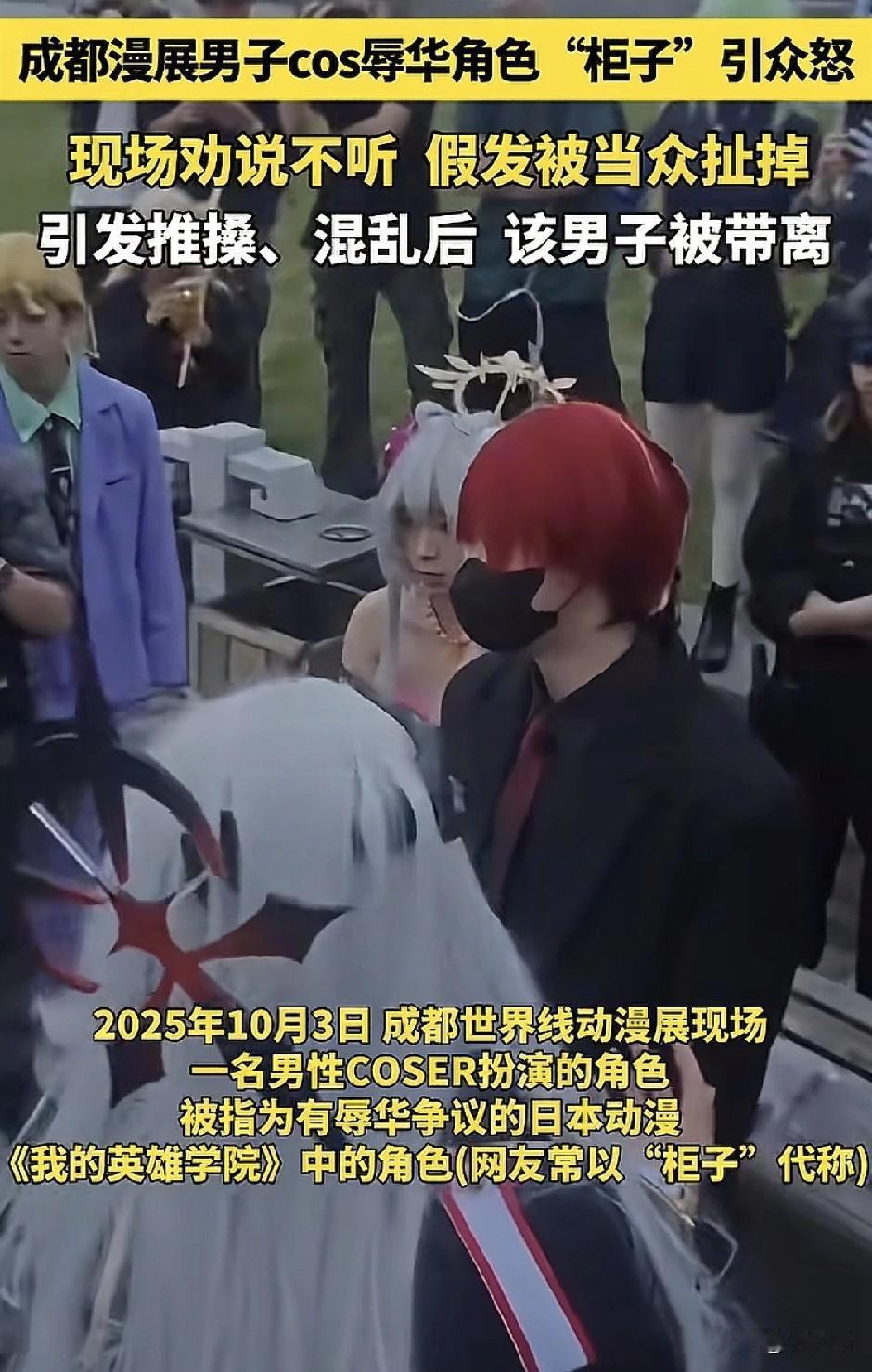 偏偏是国庆节,偏偏选择了一个“辱华”角色。你说不是故意的谁信? 近日,成都漫展上一男子惹了众怒,差点被群殴,起因是这个扎眼的红白阴阳头,不少二次元爱好者一眼就认出,这发型分明是《我的英雄学院》中 “志贺丸太” 的标志性造型。 了解日本动漫的人都知道这个角色,早就是被钉在耻辱柱上的存在,“志贺” 二字,对应着 731 部队用于人体实验的志贺氏菌;“丸太” 的日语读音 “maruta”,更是当年 731 部队对实验受害者的侮辱性称呼 “马路大”,翻译成中文就是 “原木”,暗指受害者只是任人切割的实验材料。 其实一开始已经有人劝说他拿掉这个假发,但是当时他不听劝,才引发了众怒,本来只要他拿掉了假发,大家当他不知情就算了,可是偏偏他死活不听劝,那就是明知故犯了,只是他低估了咱们的爱国情怀,如果不是安保人员,我估计该男子当场就得被群殴了。 还有他女朋友,在旁边也没有劝说他男朋友,一副不知所措的样子,似乎还没意识到问题的严重性,也有网友说她女朋友也是个精日份子,只能说不是一家人不进一家门。 但是这件事也有好的地方,起码可以看出来,绝大多数人还是有些爱国情怀的,虽然他们cos日本动漫,但是他们能分辨的出来哪一些角色可以扮演,哪一些不可以,起码底线还在。而像这位cos辱华角色的人,典型已经被日本文化侵蚀了,丧失了底线了。 我一直觉得自己是比较开明的,我从来不反对cos,也不反对cos日本动漫,但是最基本的底线不能丢,永远记住自己是中国人。