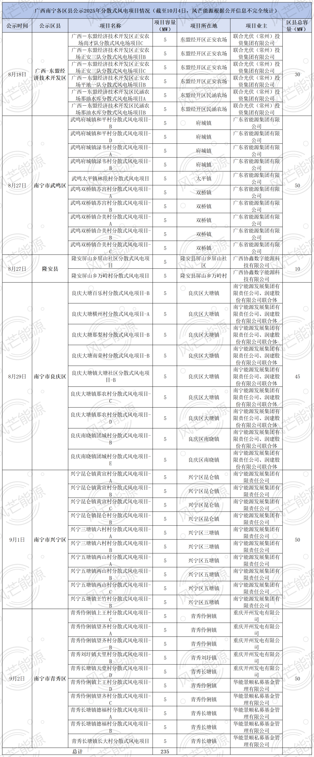 此外,据风芒能源梳理,南宁市6区县分别公示第二批分散式风电项目业主申报情况,涉及47个风电项目,规模共计235MW。