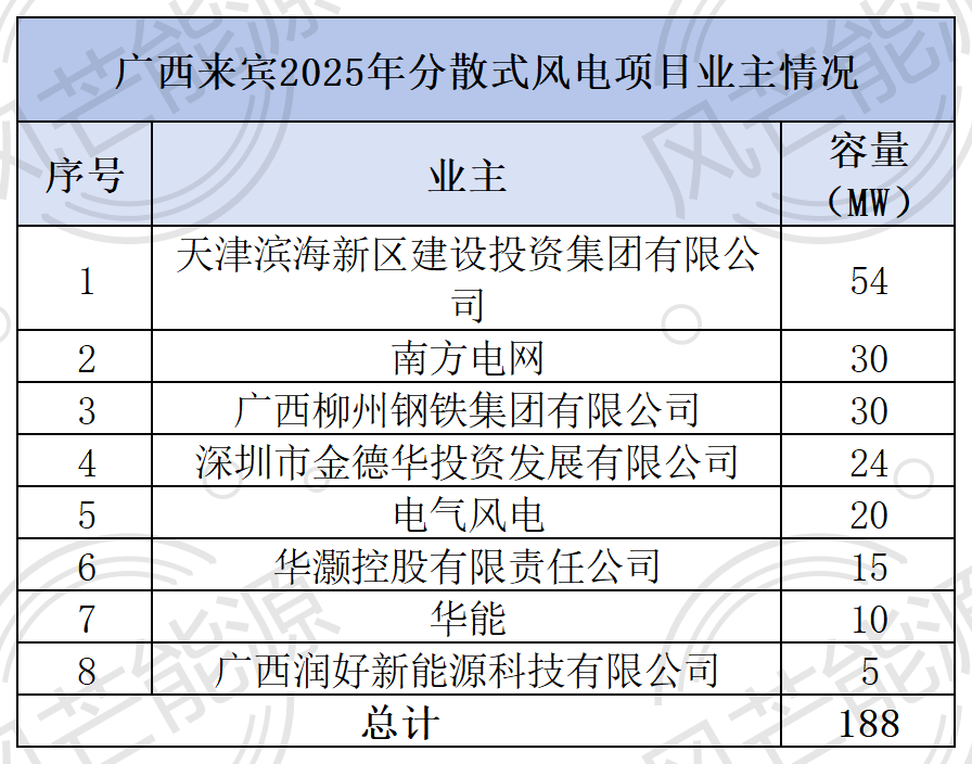 来宾方面,已公示《2025年度分散式风电项目建设方案》,涉及30个风电项目,规模共计188MW。