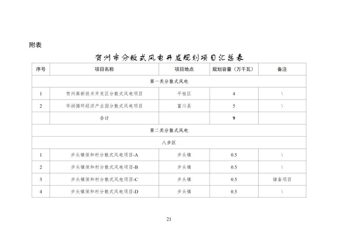 贺州高新技术开发区、华润循环经济产业示范区内共规划第一类分散式风电项目9万千瓦。