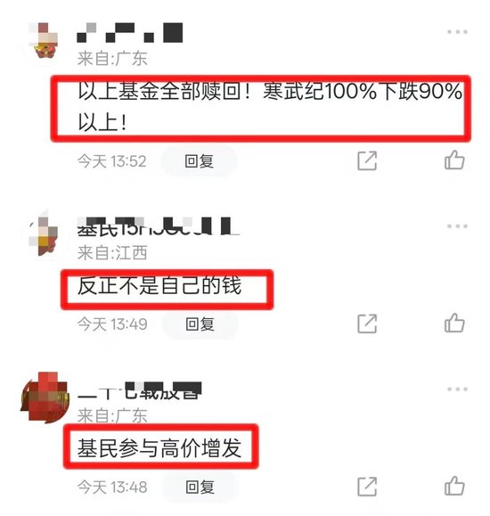 此情此景看呆不少投资者,在寒武纪东财股吧,网友们表示:“才10%的安全垫,这帮参与定增的基金想什么呢”“这些基金经理牛,亏了反正是基民的钱,唉,没办法”“基民参与高价增发”“以上基金全部赎回”……