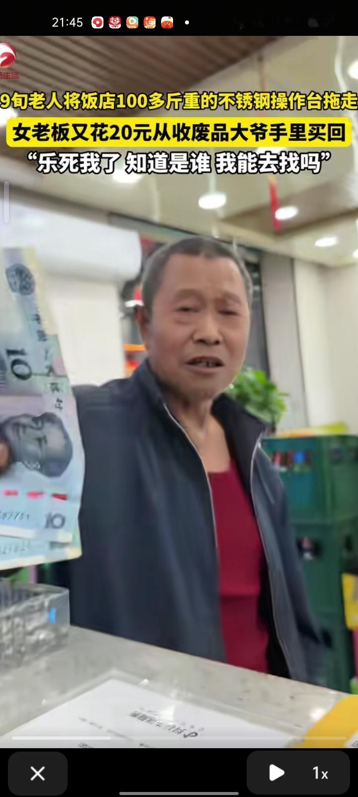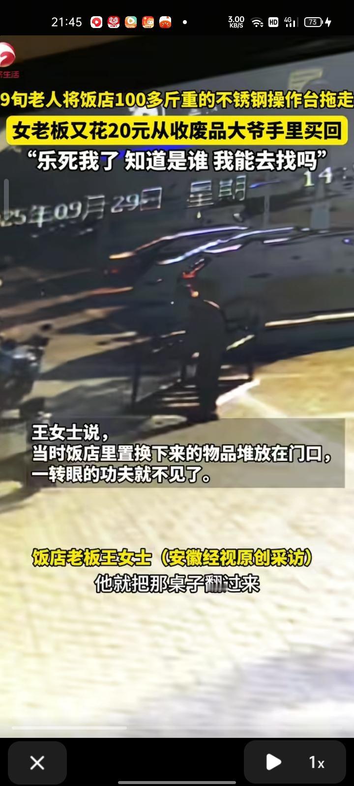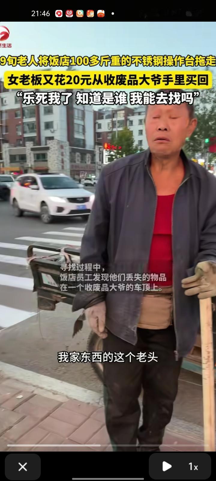 10月2日,长春德惠市。九旬老人把饭店100多斤重的不锈钢操作台拖走,老板娘又花了20元从收废品大爷手里买回,她说“乐死我了,知道是谁,我能去找吗?” 老板娘王女士说,当时饭店里置换下来的物品堆放在门口,一转眼的功夫就不见了。寻找过程中,饭店员工发现他们丢失的物品,在一个收废品大爷的车顶上。