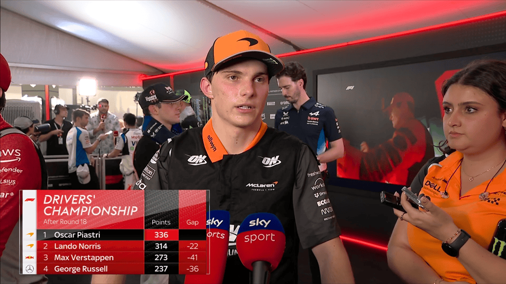 在首圈争夺被队友反超后,皮亚斯特里最终只能以P4完赛,赛后他对记者说:“显然,这场比赛很艰难,首圈也颇具挑战。我还没看回放,只是从车内视角了解了一些情况,等下我会去看看。”