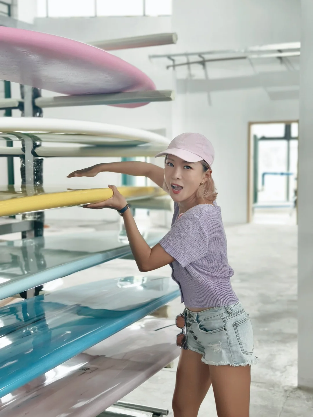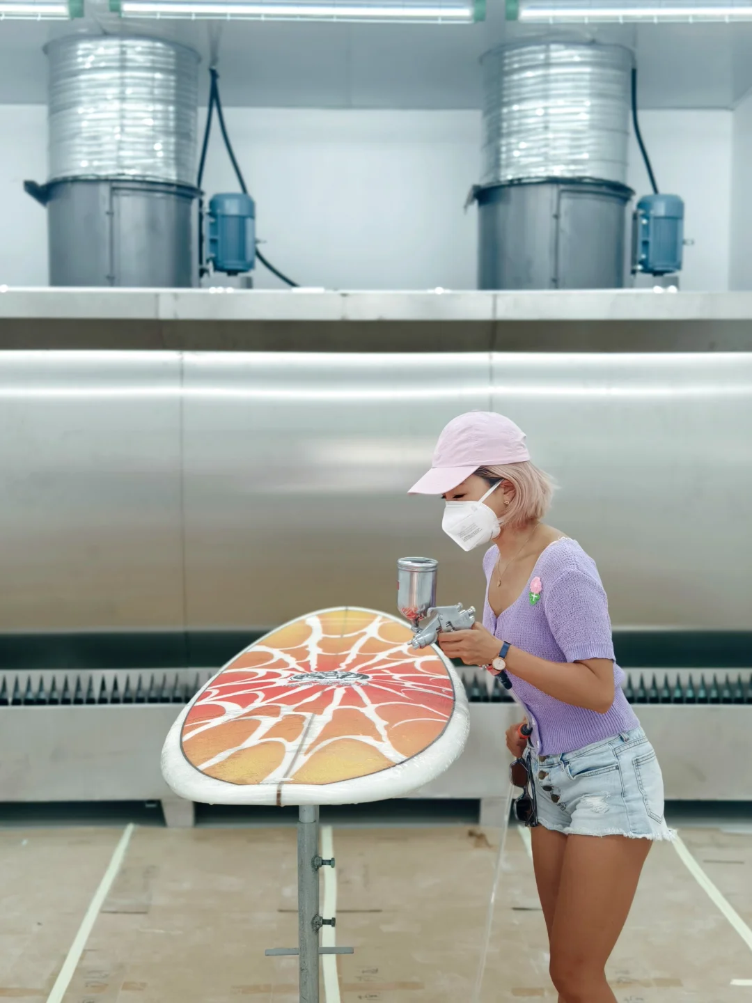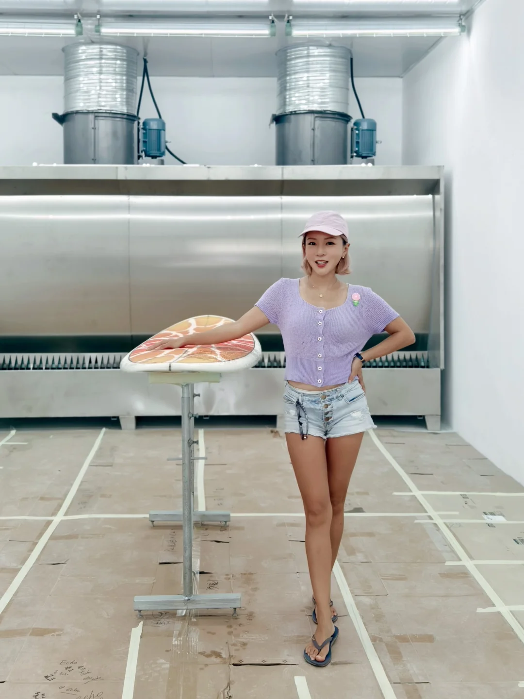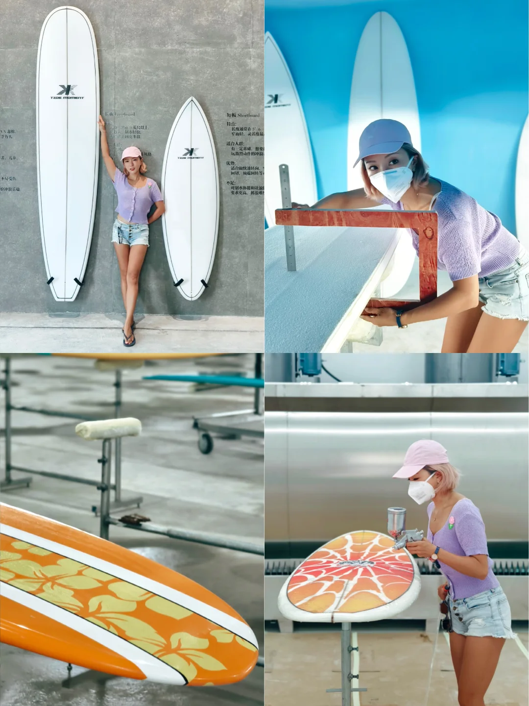 师傅说,定制浪板先在中山工厂用大型机器压型(方尾/尖尾、长宽厚都能定制),完成6️⃣道工序后,就会运到海南万宁的汐刻冲浪板展馆。在这里可以DIY设计专·属图案、喷漆、精细打磨…实现“浪板颜值自由”!