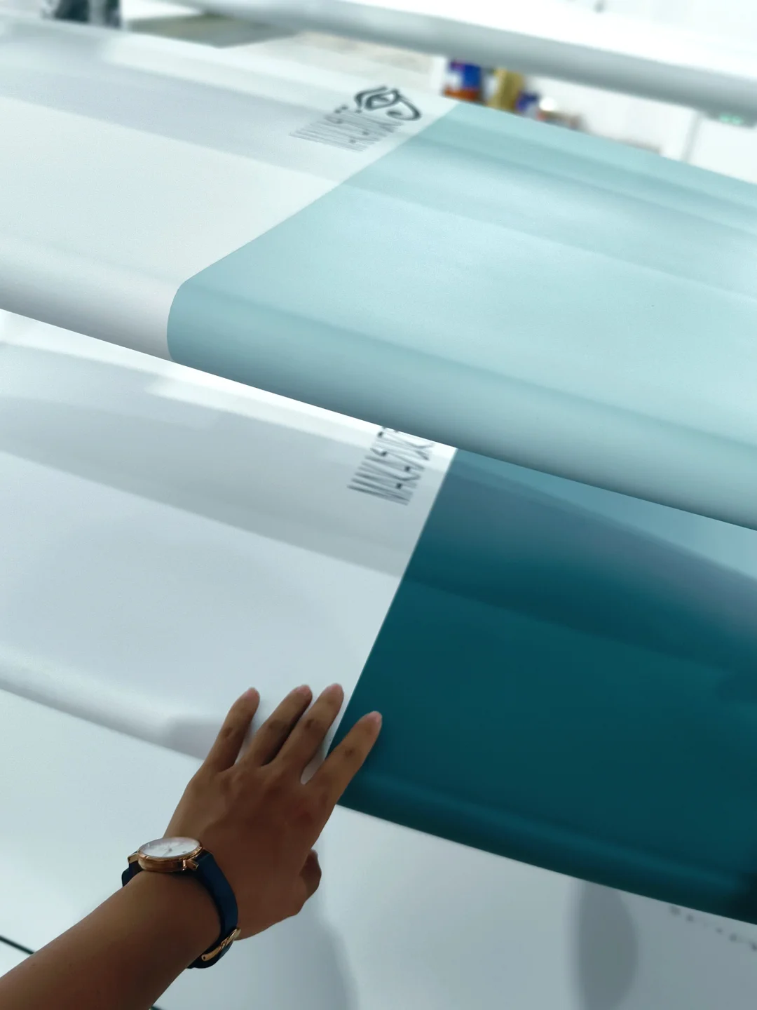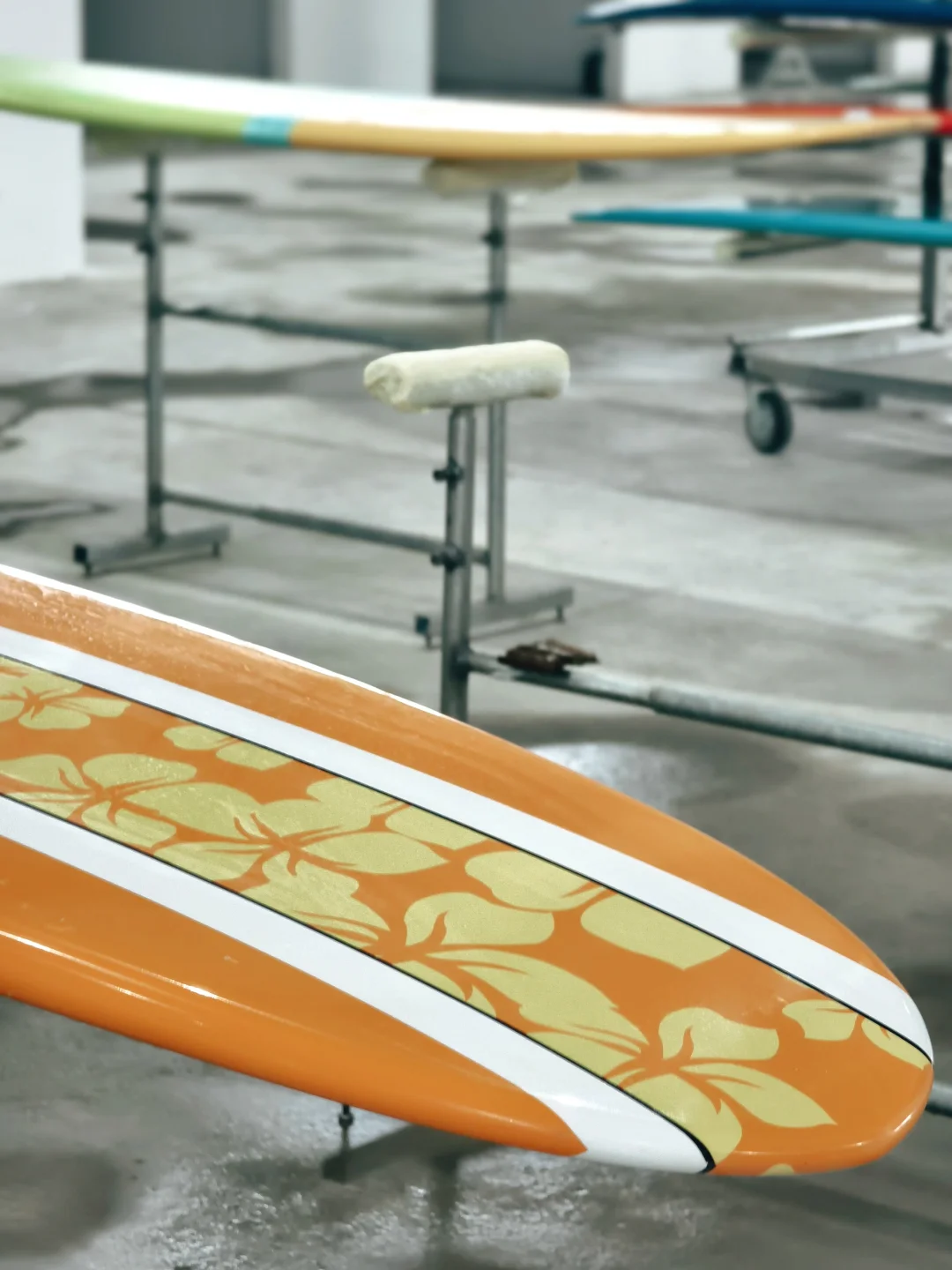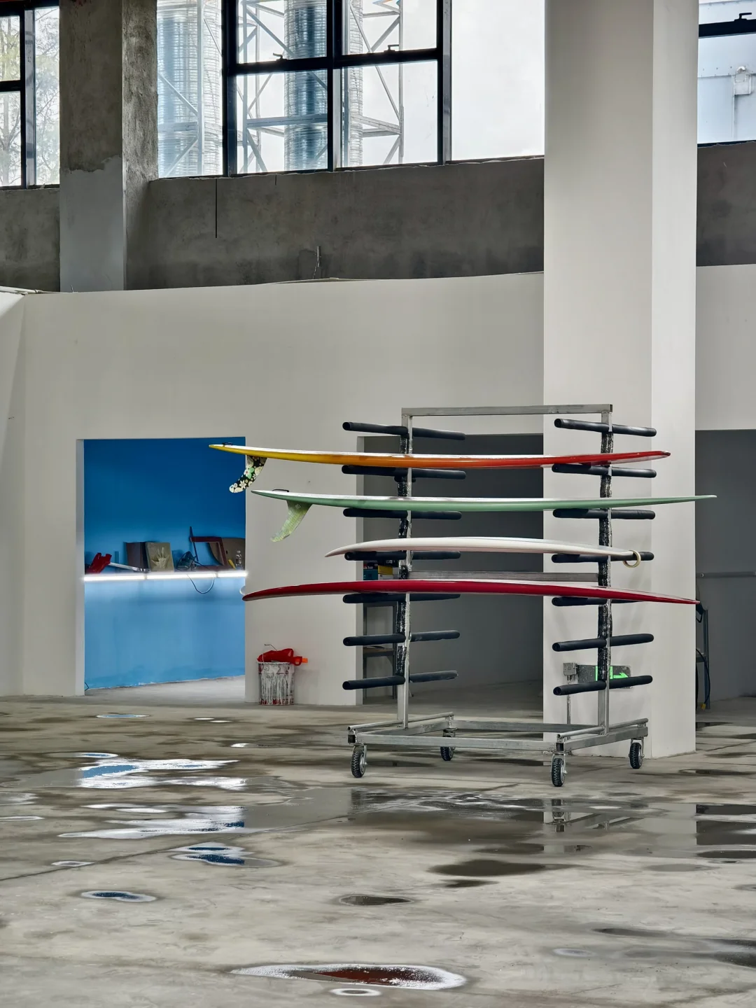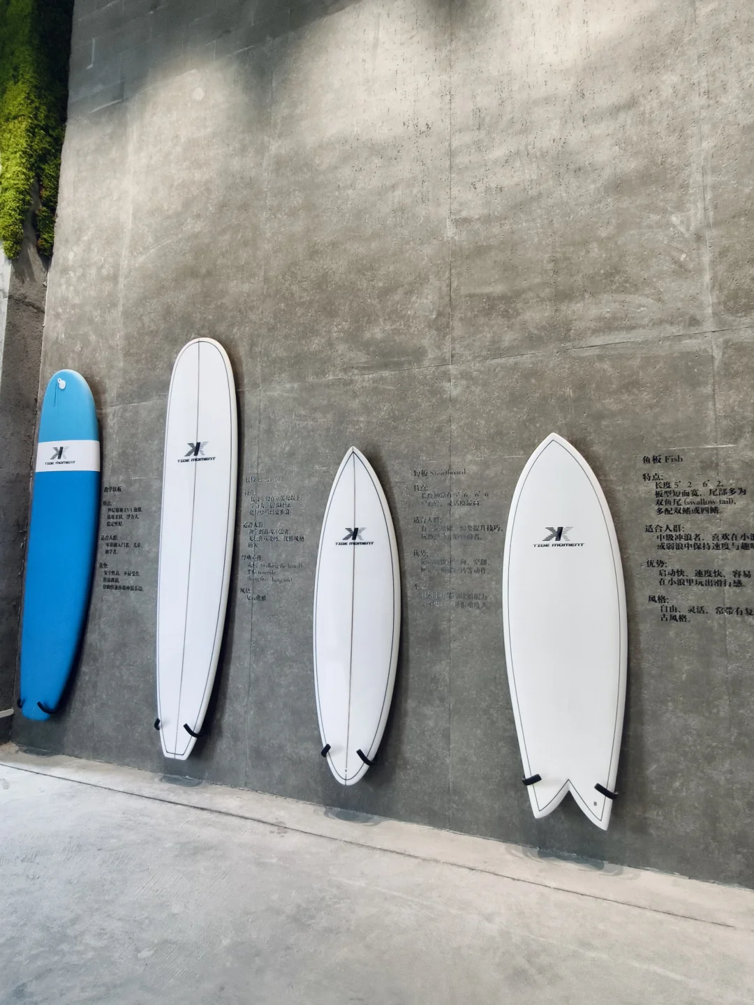 师傅说,定制浪板先在中山工厂用大型机器压型(方尾/尖尾、长宽厚都能定制),完成6️⃣道工序后,就会运到海南万宁的汐刻冲浪板展馆。在这里可以DIY设计专·属图案、喷漆、精细打磨…实现“浪板颜值自由”!