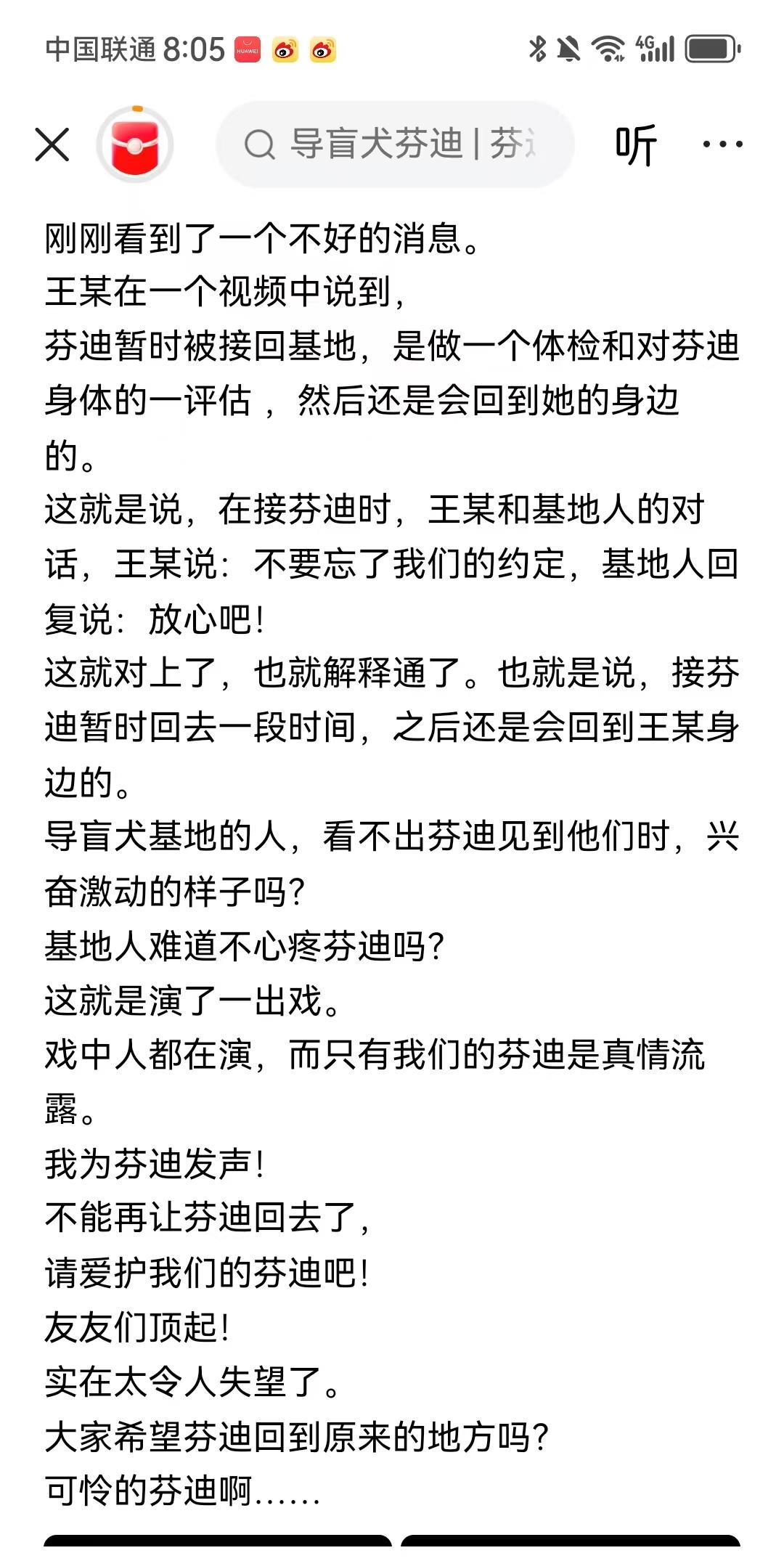 刚刚看到了一个不好的消息,王某在一个视频中说到,芬迪暂时被接回基地。关注芬迪后期状况,它不会说话,我们必须为它发声,护它周全。 人作孽,最终让不会说话的动物承受一切,芬迪再回来只会更受罪。 我晕死,要是这样的,那我天天去大连导盲犬基地,他们还要当个人吗,能这样做事的,想钱想的一点底线都没有。 我们广大网友爱护动物的人们,坚决反对芬迪回到王女士家里继续工作,你们要人性,不能人的被背景所左右,芬迪的背景是广大网友和人性的爱。 芬迪骨关节磨损,有伤痛有抑郁不适合回老地方,应该换个狗狗。 让芬迪回去就是不负责任的表现,有关部门能不能给导盲犬一个说法,能不能善意对待它,找一个善良正直负责任的主人。 看基地接芬迪的视频,就是想勿扰广大网友,网友不是傻子,基地不善待处理好芬迪的事情,全网都不答应。