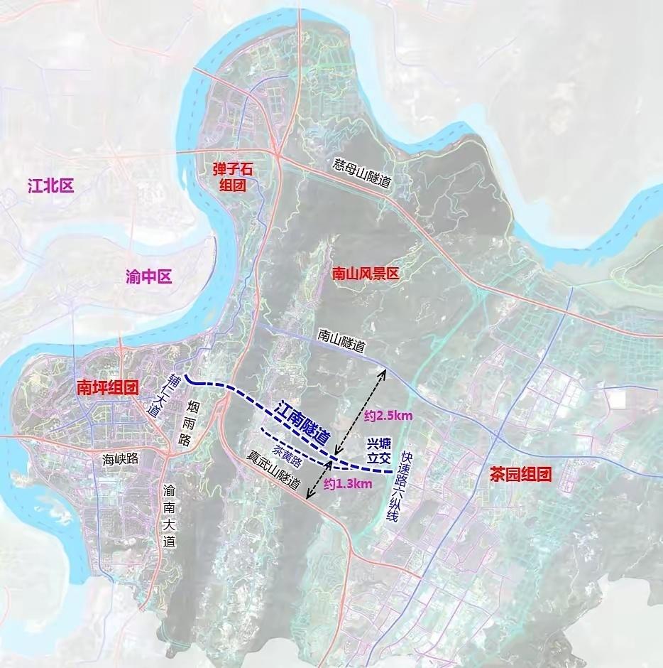南岸江南隧道工程于近日实现双洞贯通。江南隧道主线全长5.55公里,其中隧道段为4.09公里,起于辅仁大道,止于兴塘立交,双向六车道,设计时速60公里。该工程是重庆东站核心配套项目,预计2025年底实现通车,通车后将成为连接南岸南坪片区至茶园片区的最快直线通道。早晚高峰堵在真武山隧道里的司机最有体会,导航上一片飘红,半小时路程能堵成一个小时。南山隧道也好不到哪去,节假日更是堵得水泄不通。这两条隧道就像掐住南坪到茶园的脖子,来往车辆想快都快不起来。江南隧道通了后会改变从辅仁大道开车进隧道,一脚油门到兴塘立交,全程不堵车的话,10分钟准能到。