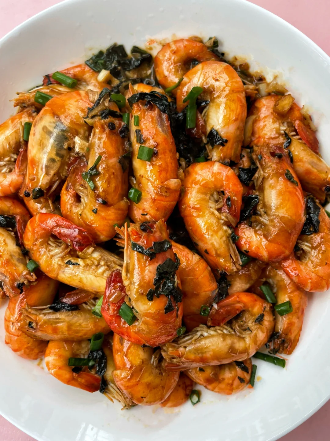 4⃣️热锅热油,把罗氏虾煎两面金黄,倒入姜蒜炒香,再倒入调好的酱汁,翻炒入味