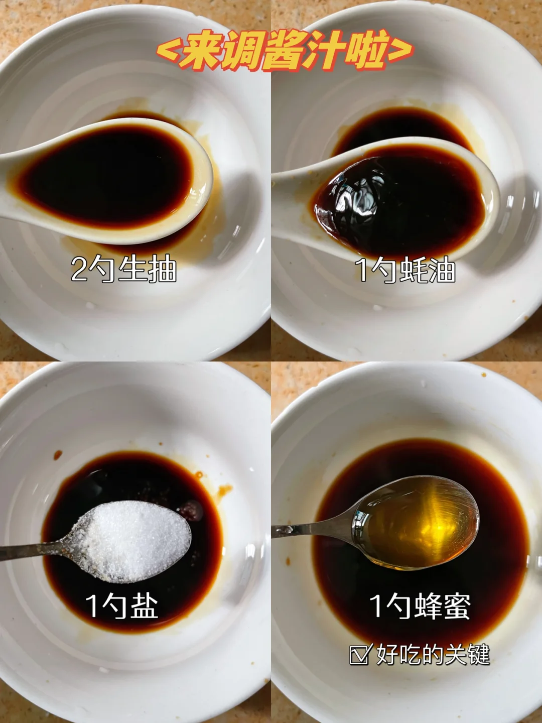 3⃣️先调个酱汁:1小勺盐+2勺生抽+1勺蚝油+1勺蜂蜜,搅拌均匀待用