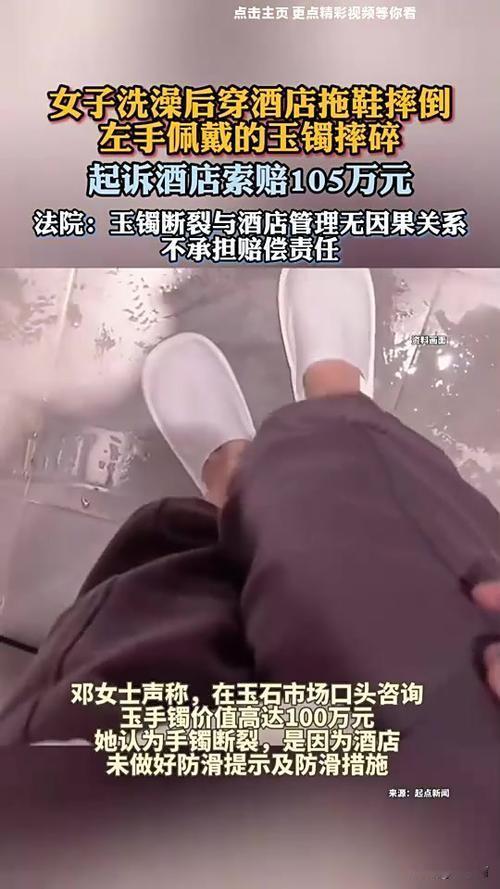 “咔嚓”一声, 一百万没了! 怪自己不小心, 还是怪酒店防护措施不到位! 云南腾冲,一女子住在酒店,刚洗完澡,穿着酒店提供的一次性纸拖鞋,回卫生间拿东西。不料脚下一滑,幸好人没跌倒,但手腕上的玉镯落地摔了个几截。 这女的还挺精明的,找到玉器店,将碎了几截的镯子请人估了价,价值100万元。 女子拿着估完价的碎镯子,找到酒店要求赔偿她100万镯子钱,外加精神损失费5万元,共计105万元。 她索赔的理由是:酒店地面滑,又没有铺设防滑垫,拖鞋也不防滑,这钱你们酒店必须赔偿! 酒店更是理由充分,认为女子作为成年人,明知道洗完澡地面滑,房间里有防滑巾你也没用,手镯打碎,完全是自己不小心造成,我们酒店最多给你免个住店费用。 女子哪里能服,直接将酒店告上法院。法院根据女人诉求,经察看现场,一审、二审,都驳回了女人的索赔诉求。判酒店一个铜板都不赔! 事情结束了,但法院的最终判决,让我觉得挺有意思的:出门在外,一些常识性的知识还是要懂的。如:进了客房,洗完澡要小心地滑;带着的贵重物品,像首饰、手镯之类的,要特别小心;睡觉前要检查一下门的防盗链是否插好等。 现在看来,人总得为自己的不小心付出一些代价,要么是金钱,要么是代价。否则的话,以后走路不看路,自己被路边的树撞了,还要找林业部门索赔呢! 大家说,是不是这个理儿?万能生活指南 个人观点,仅供参考!