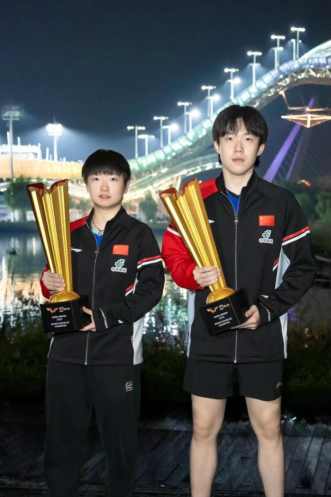 2025WTT中国大满贯混双冠亚军合影,来看下:1.孙颖莎身穿运动裤,标配小黄