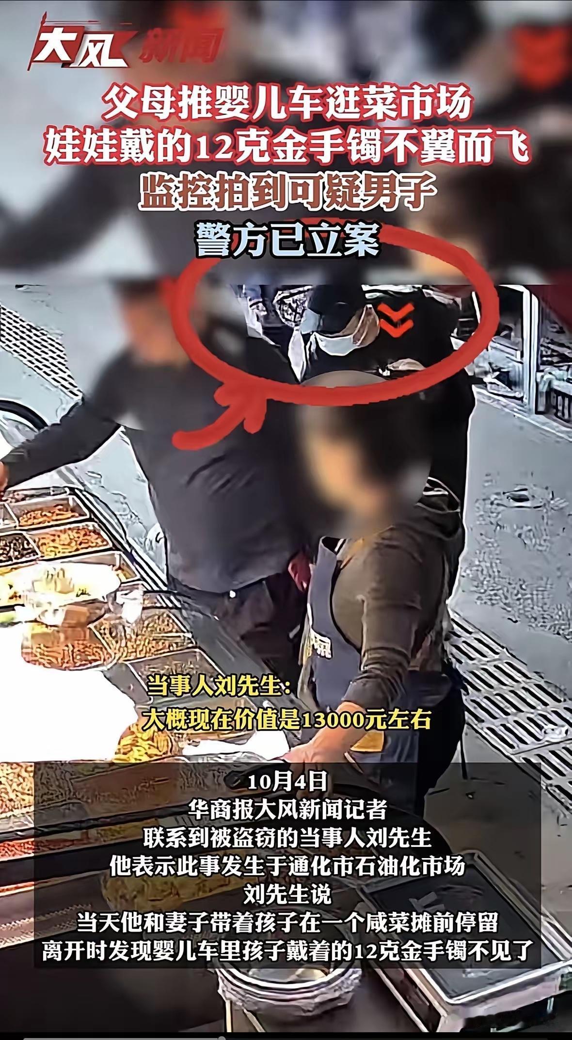 吉林,夫妻二人推着婴儿车去逛菜场,他们给孩子手上戴了一个12g的金手镯,价值13000,谁知,就在他们挑个咸菜的功夫,再一扭头,孩子手上的金镯子不见了,夫妻俩连忙报警,帽子叔叔让他们找到证据了再报案,男子只好去调监控,还真就发现一个鬼鬼祟祟的黑衣男,在他们挑咸菜的时候把手伸进了婴儿车里,接着火速消失在人群中。这下证据确凿了,可后续却没夫妻俩想得那么顺利。 10月2号那天,刘先生和媳妇推着婴儿车带娃去市场买菜。 —— 刘先生把视频拷到手机,一路小跑回派出所,心想:人证物证都在,抓人没跑了吧?值班民警瞄了两眼,点点头:“行,先立案,等消息。”一句话,把夫妻俩打回菜市场——回家等。可这一等,就是半个月,电话没响,微信没动,连110都没再回访问候。刘太太急得夜里把娃手镯的空位拍了张照片,发抖音,配文:“13000的教训,提醒宝妈别炫富。”评论区瞬间炸锅:有人骂小偷缺德,有人怪爸妈心大,还有人支招“以后戴个铜的,外面镀层金粉,骗过贼再说”。 刘先生心里窝火,又跑派出所。办案民警摊手:市场人流大,黑衣男口罩帽子全套,脸看不清,身份证更没影,系统比对像大海里捞针。刘先生憋得脸红:“那我自己去打印照片贴市场行不行?”民警赶紧拦:“私人通缉违法,您别添乱。”一句话,又把火给摁回肚子。回家路上,他看谁都像嫌疑人,连卖烤肠的大叔穿黑外套,他都盯半天,差点把人家香肠盯糊。 更郁闷的是,保险公司也拒赔。理由写得明明白白:“金银饰品未另行投保,且不在随车行李范围内。”刘太太气得直拍柜台:“我给孩子戴手上,又不是放后备箱!”客服小姐姐温柔重复:“不好意思,条款就是这样。”一万三,瞬间成了只能自认倒霉的“学费”。刘太太回小区,逢宝妈就把手镯故事讲一遍,讲得保安大叔都背下来了,一见她就喊:“今天没戴真金吧?” 我听完这事,想起自己小时候,我妈给我戴了根红绳,上面就穿一颗塑料珠子,邻居笑“寒碜”,我妈回:“贼见了都嫌浪费时间。”那时候不懂,现在才品出滋味——不是买不起,而是怕丢了心疼。可话说回来,戴个金镯就是炫富?我看未必,更多是图个吉利,孩子白嫩手腕配个金闪闪,老人看着欢喜。坏的不是镯子,是那只伸进婴儿车的手。菜市场本该是烟火气最浓的地方,如今却得先环顾四周,跟防贼似的,多累。 有人出主意:给婴儿车装“防盗拉链”“隐形摄像头”,再不行上GPS定位手镯。听着高科技,可养娃已经够费爹妈,还要变身007?防盗本该是别人的本分,最后却全推给家长,这逻辑真够魔幻。要我说,市场管理方也该担点责——监控装得比咸菜坛子还密,却没人实时盯屏;高峰时段没有巡逻,光靠事后“大海捞人”,效率当然低。小偷就是算准了这点,才敢把婴儿车当提款机。 刘先生后来学精了,给娃换成软硅胶手环,上面印着“我很穷,别摸我”。自嘲归自嘲,他仍天天刷派出所小程序,盼着案件状态哪天变“已破案”。刘太太更是加入“反扒妈妈群”,一有空就去市场转,专盯穿黑衣戴帽子的,比便衣还勤快。她说不为追回那一万三,就想看看坏人长啥样,好让心里那口闷气出来。可坏人真会被她撞见?难说。更多时候,他们像泥鳅,滑不留手,留下一地鸡毛让家长自己收拾。 说到底,一个金镯子只是缩影。它提醒我们:再普通的生活场景,也可能藏着不劳而获的手;再可爱的娃娃,也可能成为目标。与其事后懊悔,不如事前减配:出门少戴贵重、婴儿车加层简易遮罩、人多时把孩子抱起来,都是笨办法,却有效。至于抓贼,那是警察的饭碗,咱们能做的,就是把饭碗端稳——提供清晰视频、准确时间、嫌疑人特征,别再添乱。剩下的,交给时间和运气。毕竟,养娃路上,谁还没交过几次“学费”?只是有的贵,有的便宜,有的疼三天,有的记一辈子。 各位读者你们怎么看?欢迎在评论区讨论。