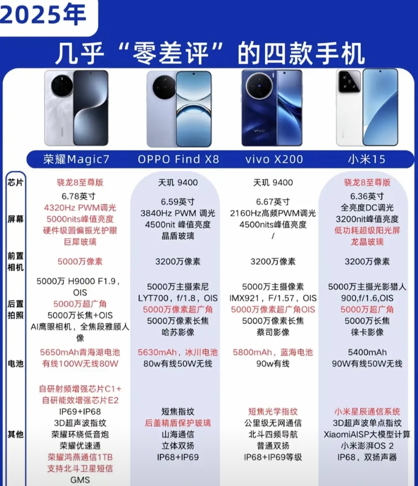 友商看了都沉默!2025荣耀Magic7凭这些硬实力登顶“零差评”榜首 2025年手机圈杀疯了!但荣耀Magic7硬是凭硬实力跻身“零差评”阵营,直接甩出王炸配置: 骁龙8至尊版芯片,性能狂暴输出; 6.78英寸4320Hz PWM调光巨犀玻璃屏,硬件级护瞳,刷剧玩游戏眼睛不累; 5000万三摄+AI鹰眼相机,全焦段稚颜人像,随手一拍都是大片; 5650mAh青海湖电池+100W有线+80W无线快充,续航回血双绝; 自研双芯+IP69+IP68+3D超声指纹+荣耀超线性双扬,更支持北斗卫星短信和GMS! 全能无短板,这样的荣耀Magic7,不火没道理!