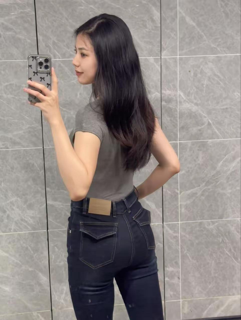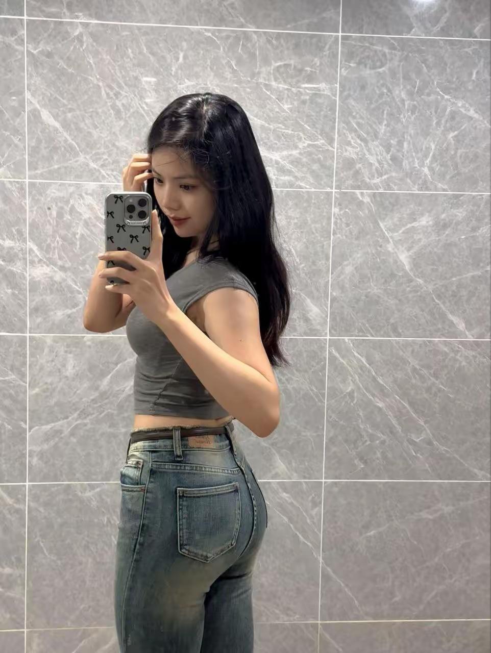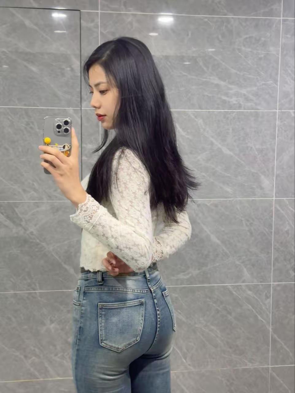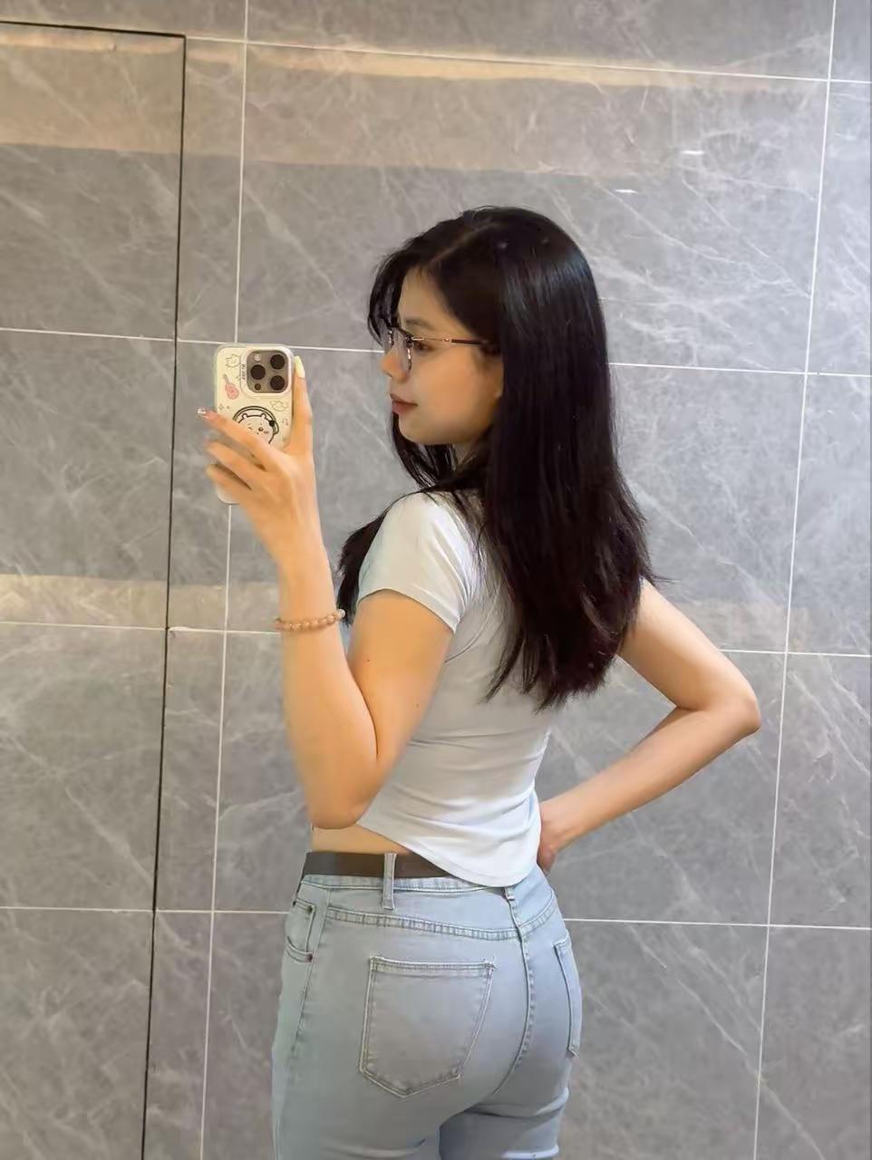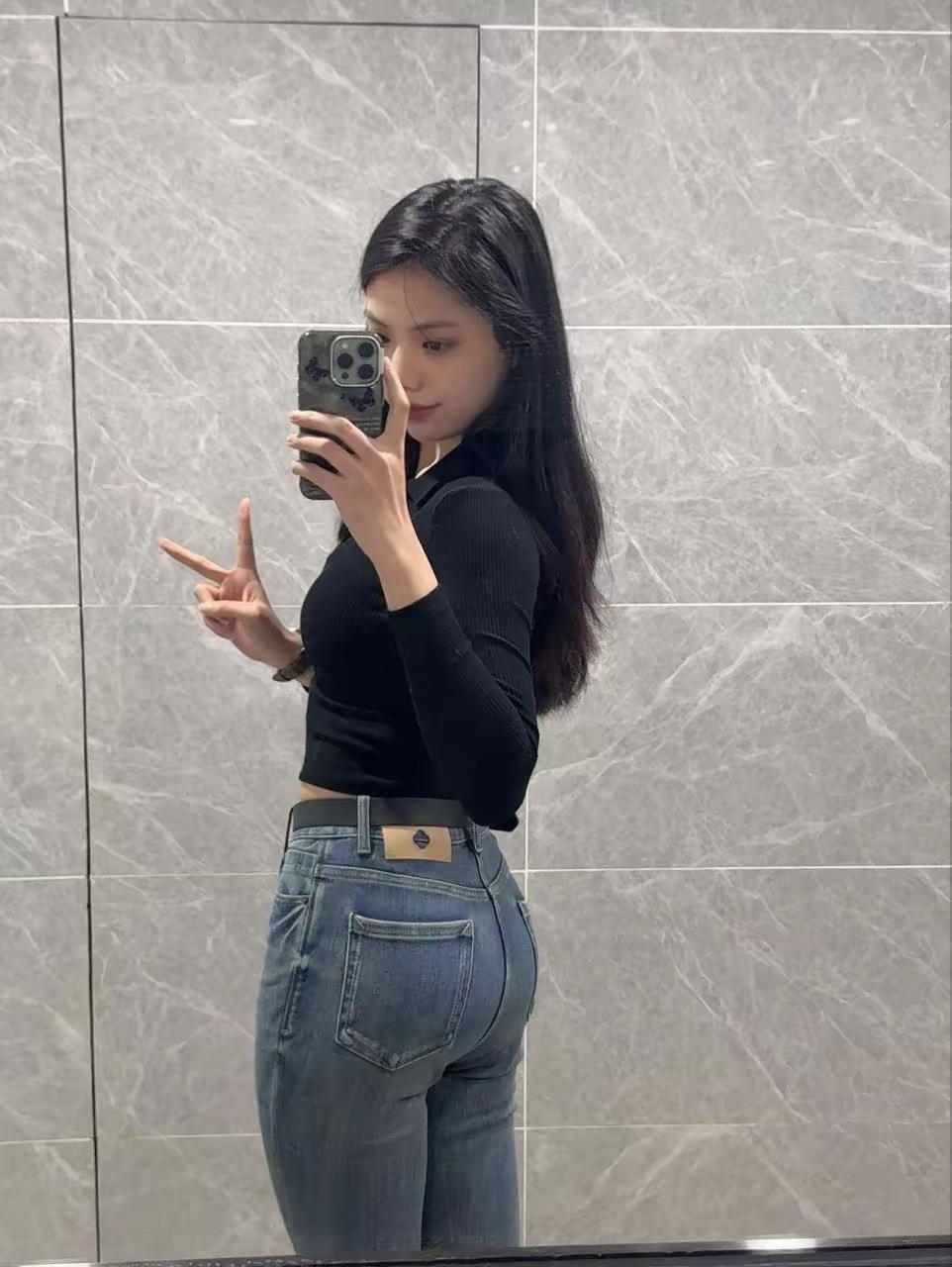 自拍时刻,笑容甜美,牛仔裤显身材。