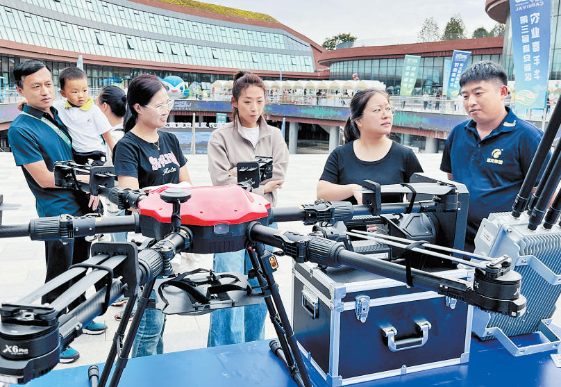 9月30日,2025年(第三届)雄安新区农业嘉年华在雄安郊野公园开幕。图为游人在植保无人机展区参观。河北日报记者刘光昱摄