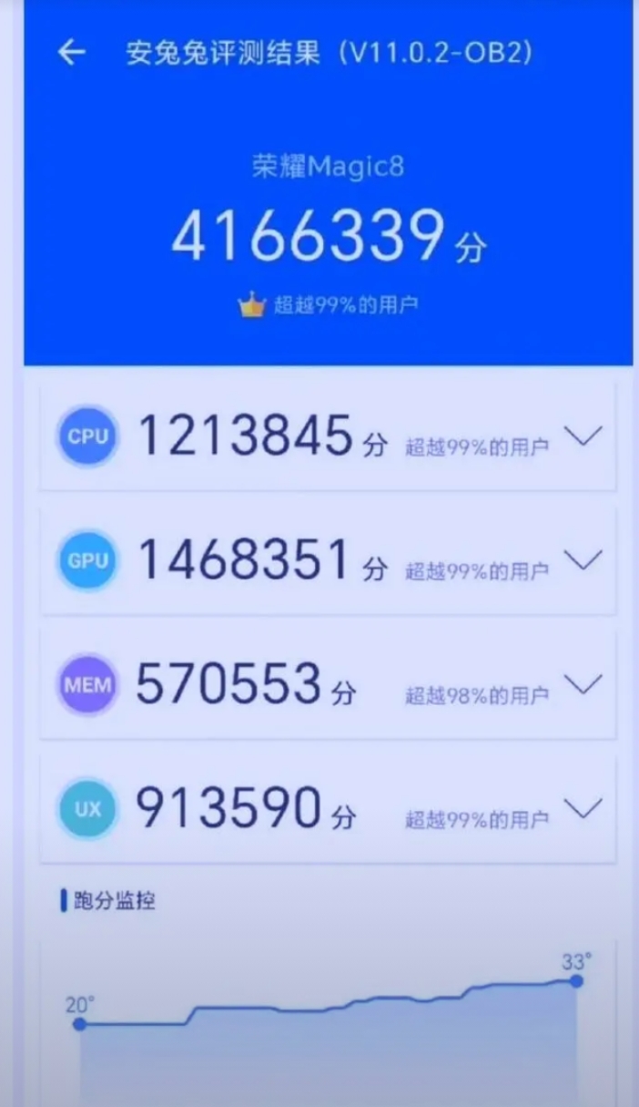 最后就是性能方面,虽然荣耀高管只是曝光了一个Magic8的跑分。但是毫无疑问,416万的跑分算是第一梯队了