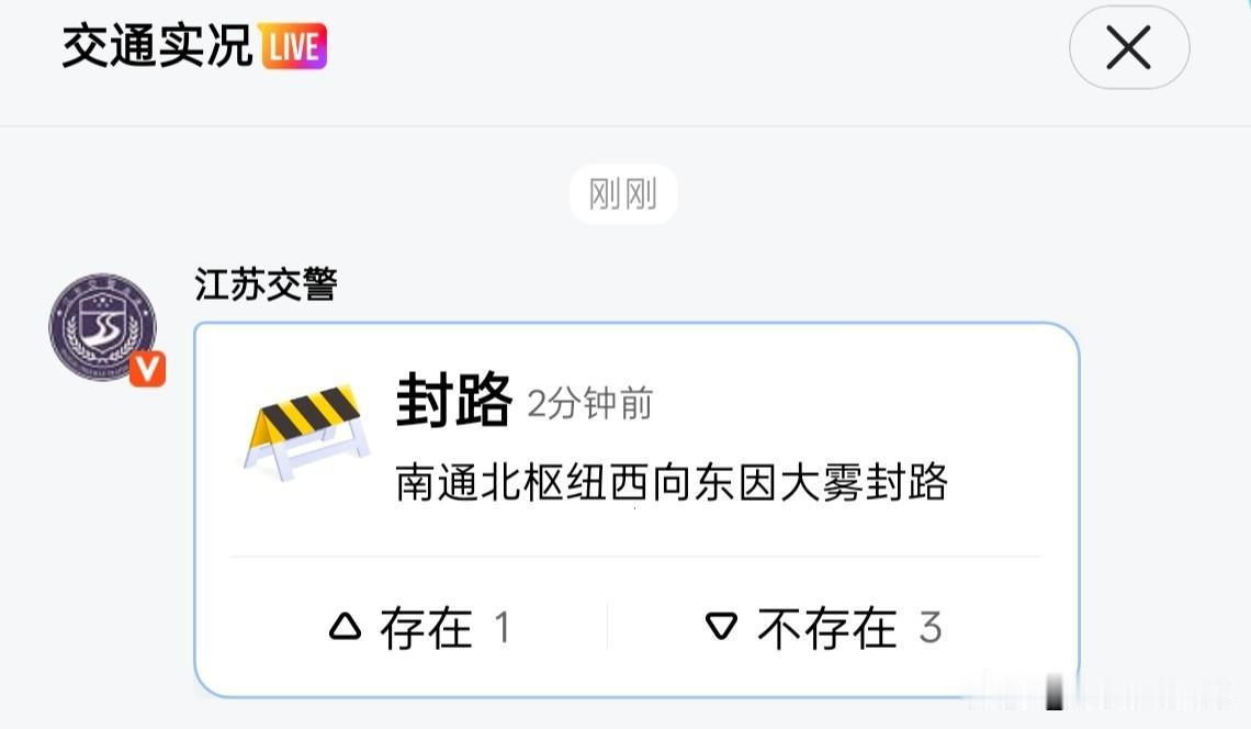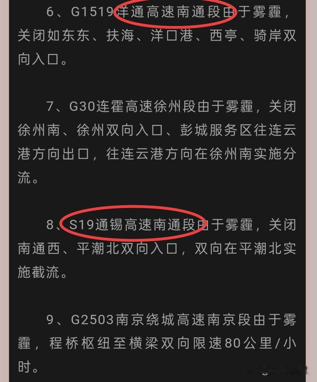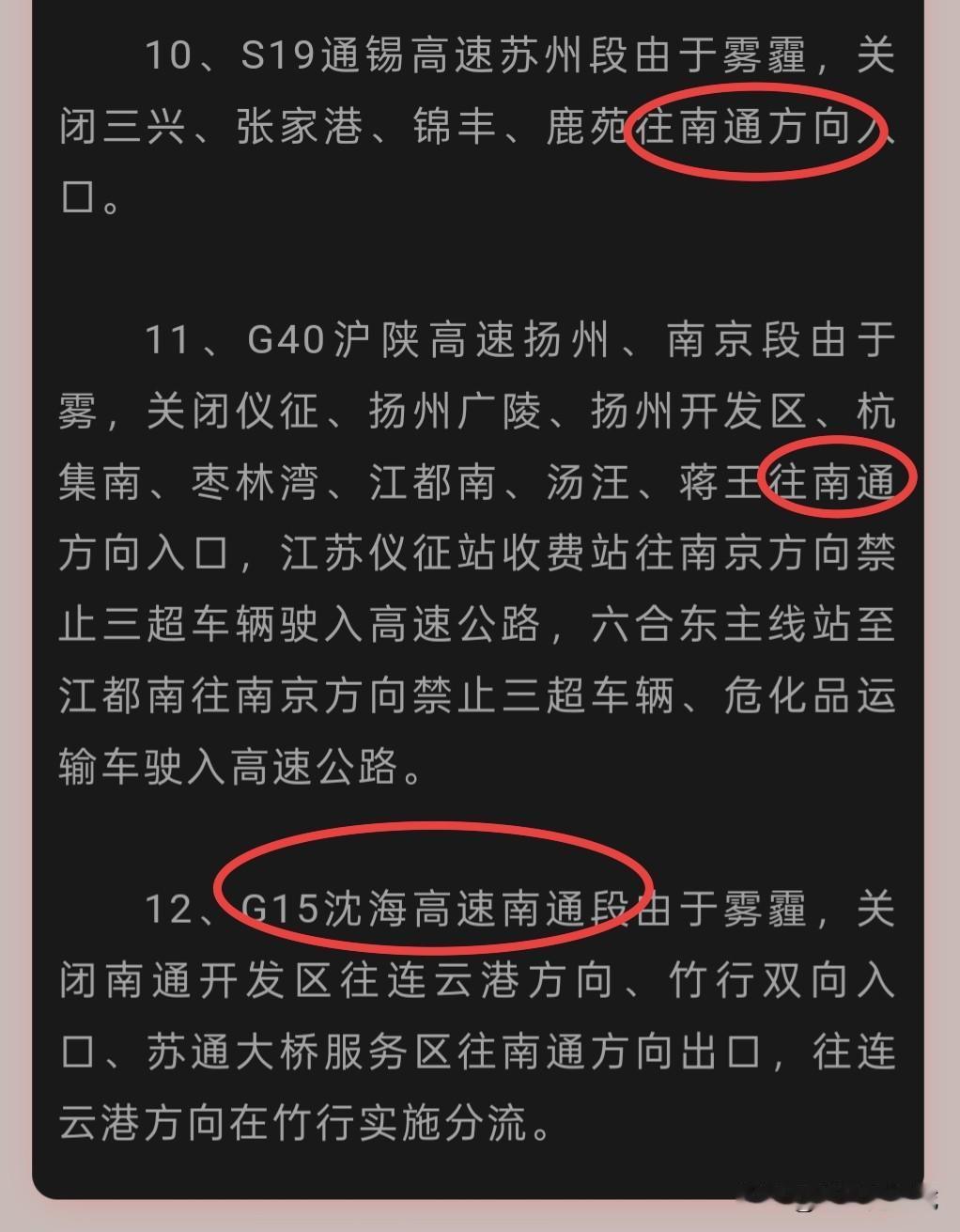 苏通大桥今天终于不堵了!可惜也上不去了! 今天清晨的大雾,似乎对南通的影响最大?看了最新发布的高速封路公告, 南通境内的高速影响是最大的!几个方向的高速都被封了! S19通锡高速,S1519通洋高速,G40沪陕高速,G15沿海高速,基本上南通境内的高速出入口都是双向关闭了,现在南通境内的高速上是一片绿! 就连天天堵车的苏通大桥,现在也没车了,畅通无阻!可惜谁也上不去了,没想到,缓解高速堵车的,居然是一场大雾,正好让拥堵不堪的高速和大桥休息下。 不过今天本来还有去海安和如皋的计划,看样子也要等到中午了,如果全部走下面的国道或者省道,无论是S225还是G204,估计也是车流密集,毕竟高速的车都被赶下来了。 不知道这个大雾什么时候能散去?南通北收费站什么时候可以开放呢?