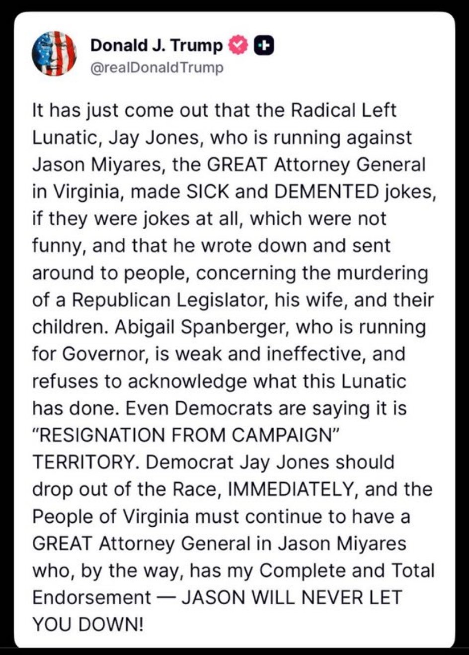 特朗普总统对弗吉尼亚州司法部长候选人杰伊·琼斯发表了看法。