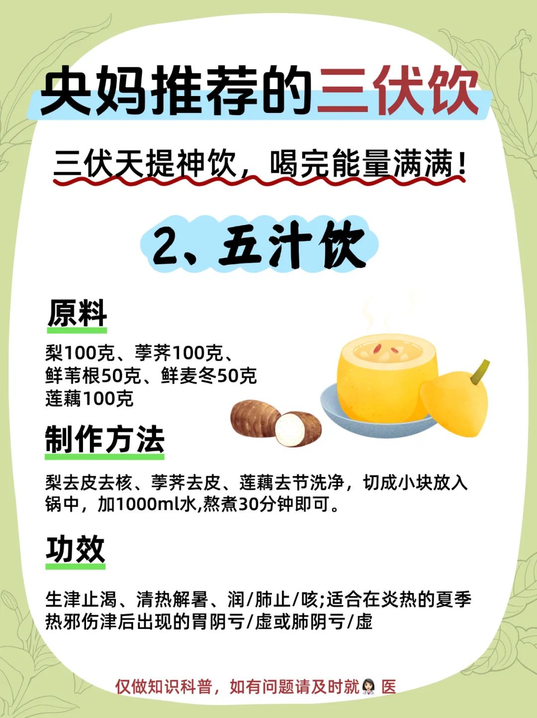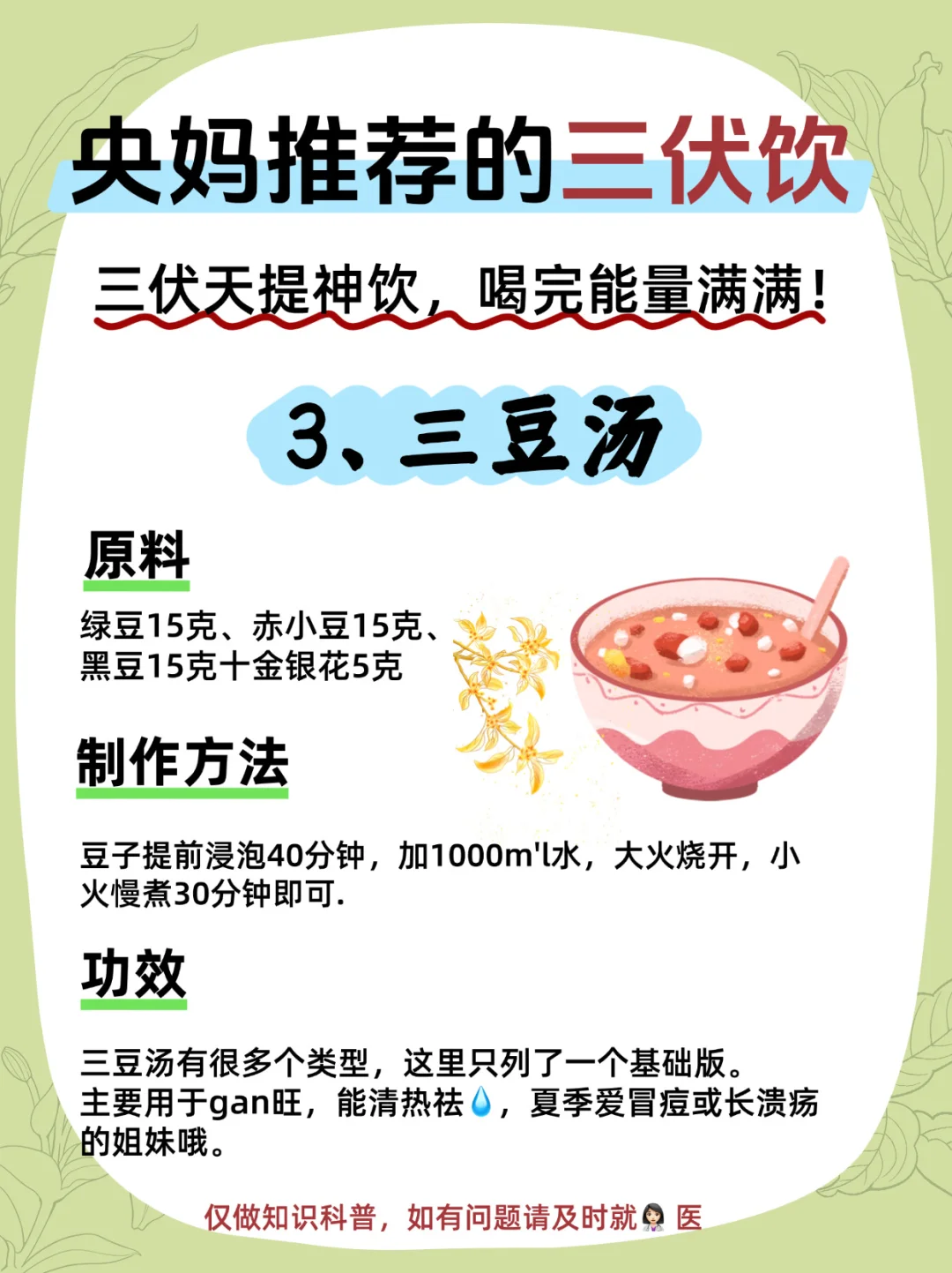 最近这天气,出门走两步就像进了蒸笼,连呼吸都带着热气。 三伏天真是名不虚传,热得人头晕眼花,连吃饭都没胃口。 这时候,一杯清凉解暑的饮品简直就是救命稻草! 今天就来给大家分享3杯我私藏的"神仙水", 不仅解渴消暑,还能让你瞬间满血复活, 关键是不伤身,比那些冰镇饮料强多了! [一R]甘麦大枣茶 [二R]五汁饮 [三R]三豆汤 (具体做法在图片里,简单又方法哦~) · 三伏天喝起来,整个夏天元气满满~ 三伏饮 在轻养生 三伏天养生去湿气